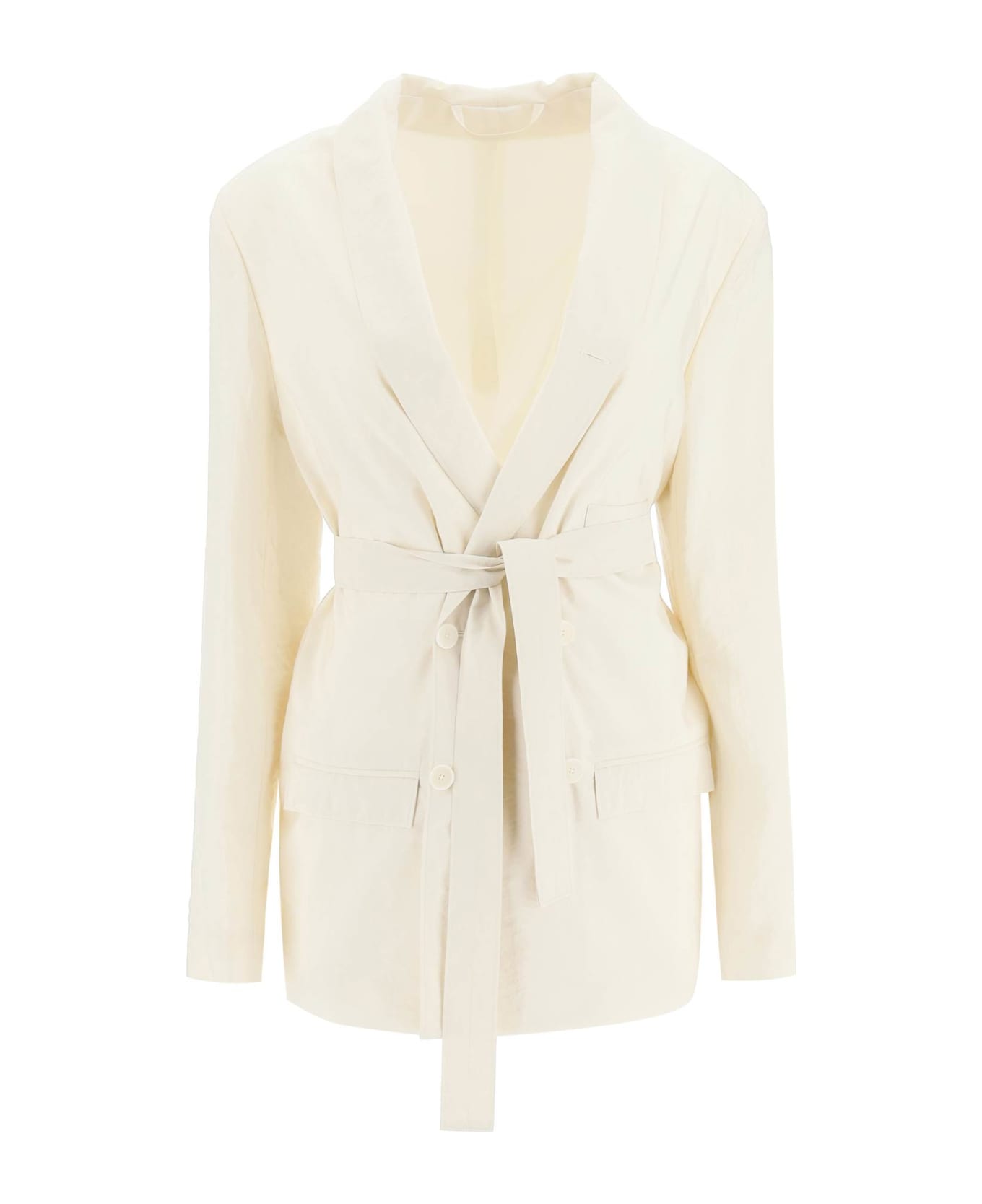Double-breasted blazer in dry silk, a special silk blend fabric with a crinkled finish from Lemaire. Four-button style with convertible shawl collar and flap pockets. Loose fit, adjustable with matching self-tie belt. Viscose lining, two inside pockets. The model is 177 cm tall and wears a size XS.