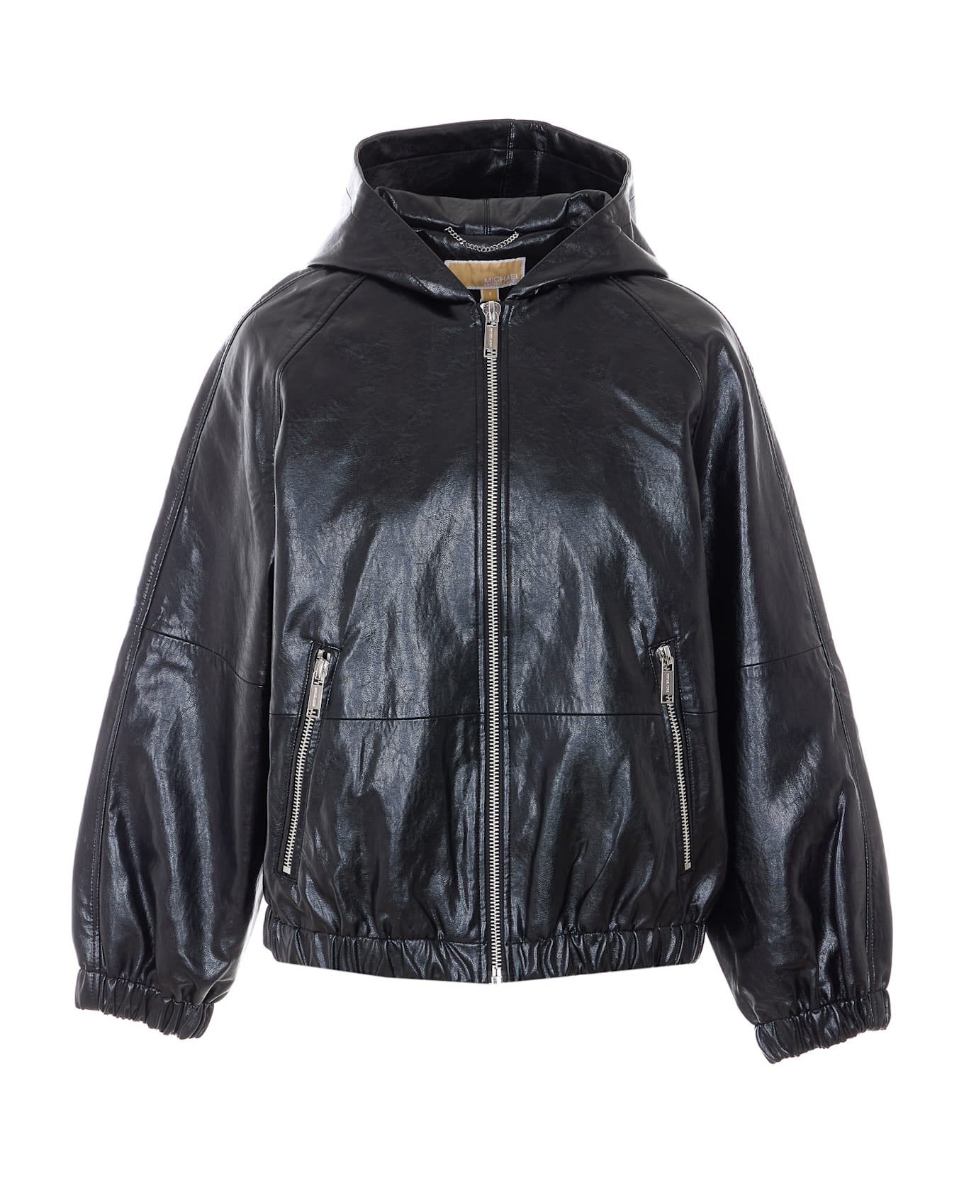Michael michael Kors black jacket with zip closure, long sleeves, elasticized on waist, hood detail, leather effect Composition: 74% Viscose, 14% Polyester, 8% Cotton, 4% Metal