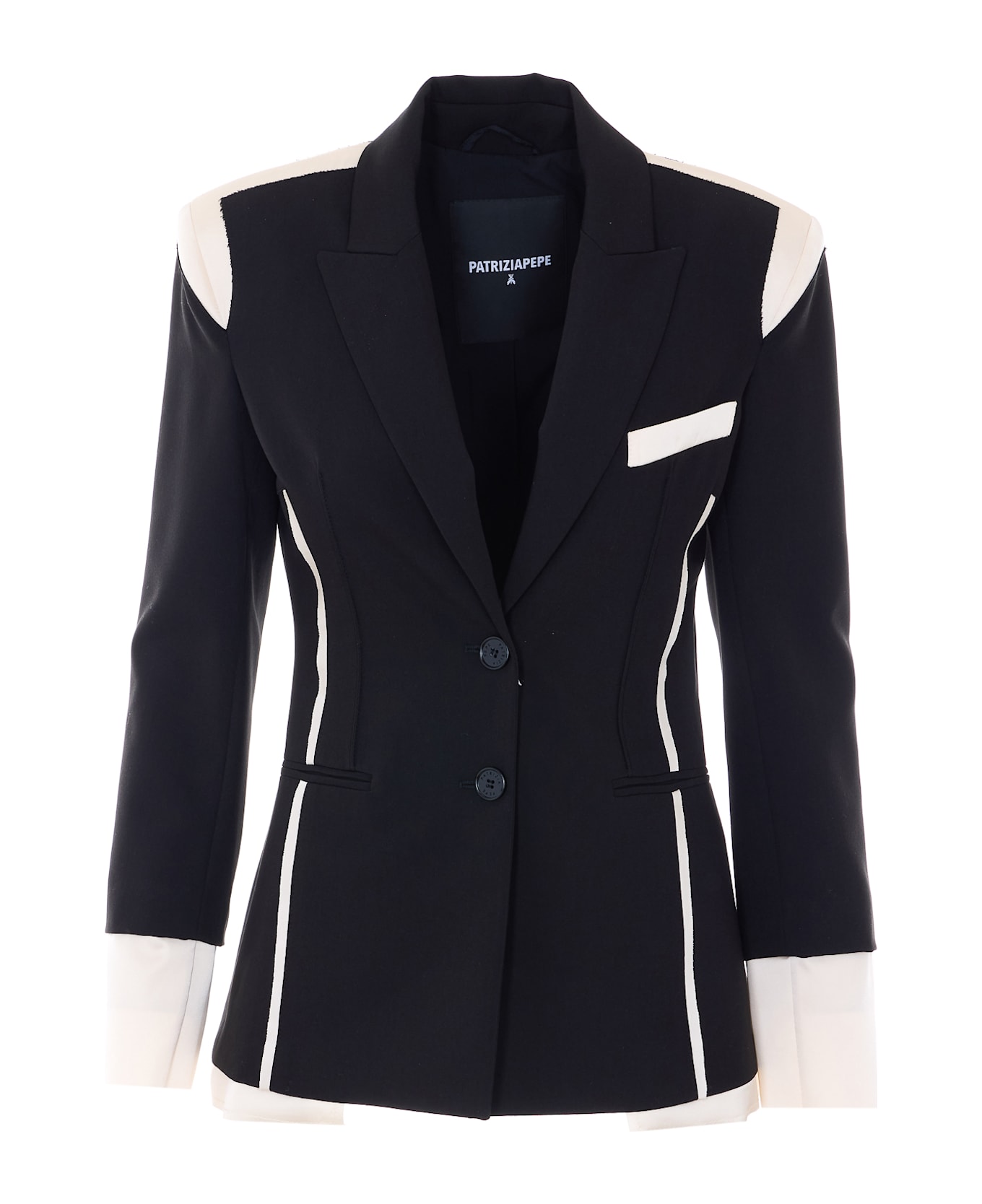 Patrizia Pepe black and white jacket with frontal buttons closure, reinforced shoulder, V-neck