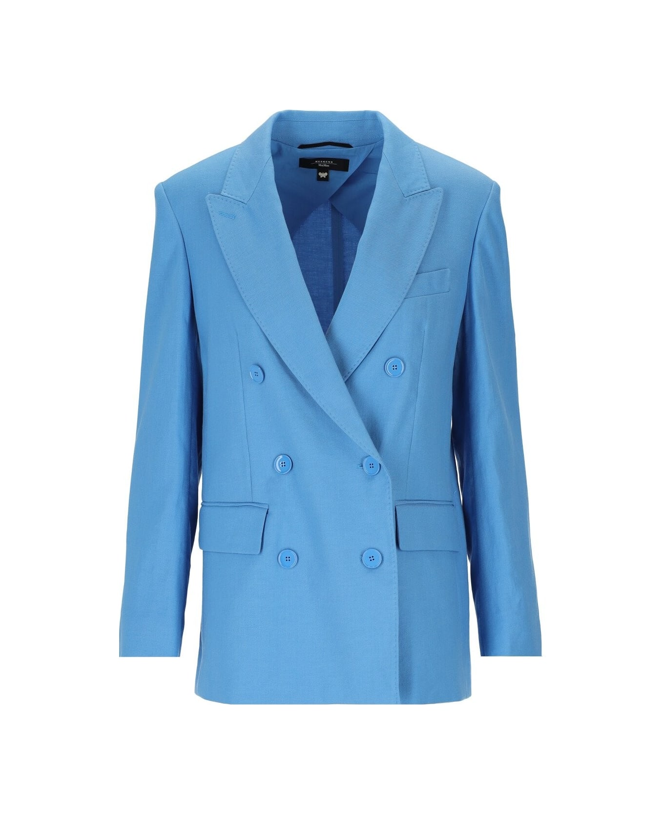 Max Mara Weekend Yarden blazer made of light blue linen and cotton blend. Padded shoulders, lapel collar and back vent. Double-breasted closure with buttons. Composition: 58% linen, 39% cotton, 3% elastane; 100% cotton body lining; sleeve lining 100% polyester.