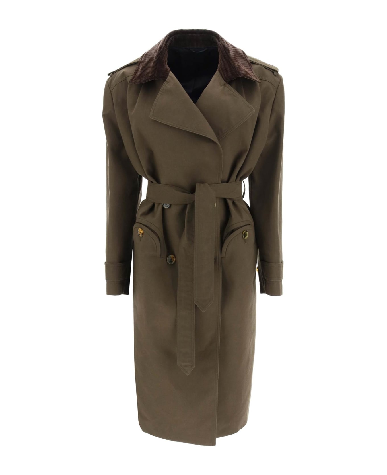 Vagrant wait coat by Blazé Milano crafted in japanese cotton canvas with corduroy collar, double-breasted closure with tortoiseshell buttons and matching self-tie belt. Iconic smiley pockets, adjustable cuffs with strap, shoulder epaulettes, notch lapels and rear middle vent. Viscose lining and one inner welt pocket with button. The model is 177 cm tall and wears a size 1.