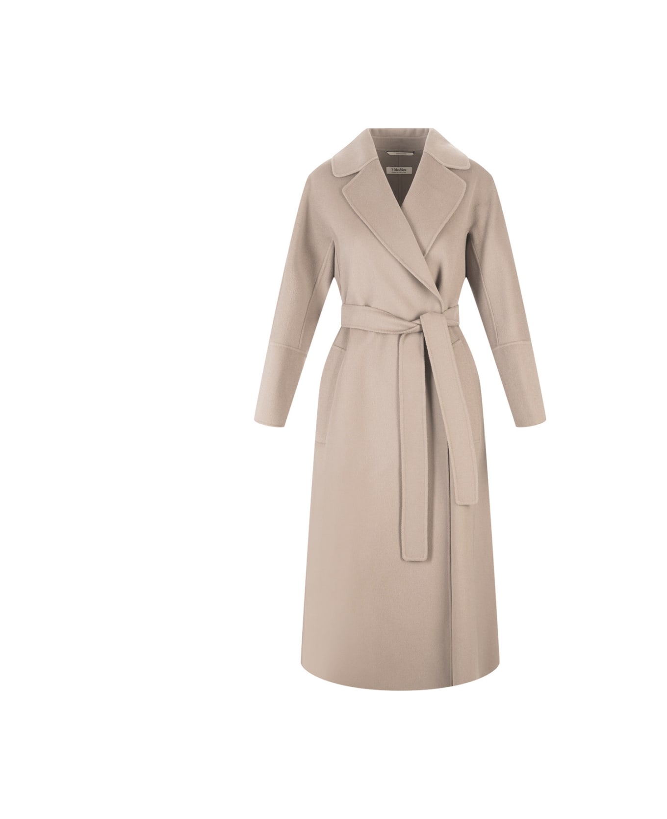 A long coat with a robe silhouette, the Elisa model by 'S Max Mara is made of fine hand-stitched light grey double pure wool fabric. The model features a lapel collar, welt pockets and long kimono sleeves with a high cuff and side slit. The matching belt emphasises the waist.