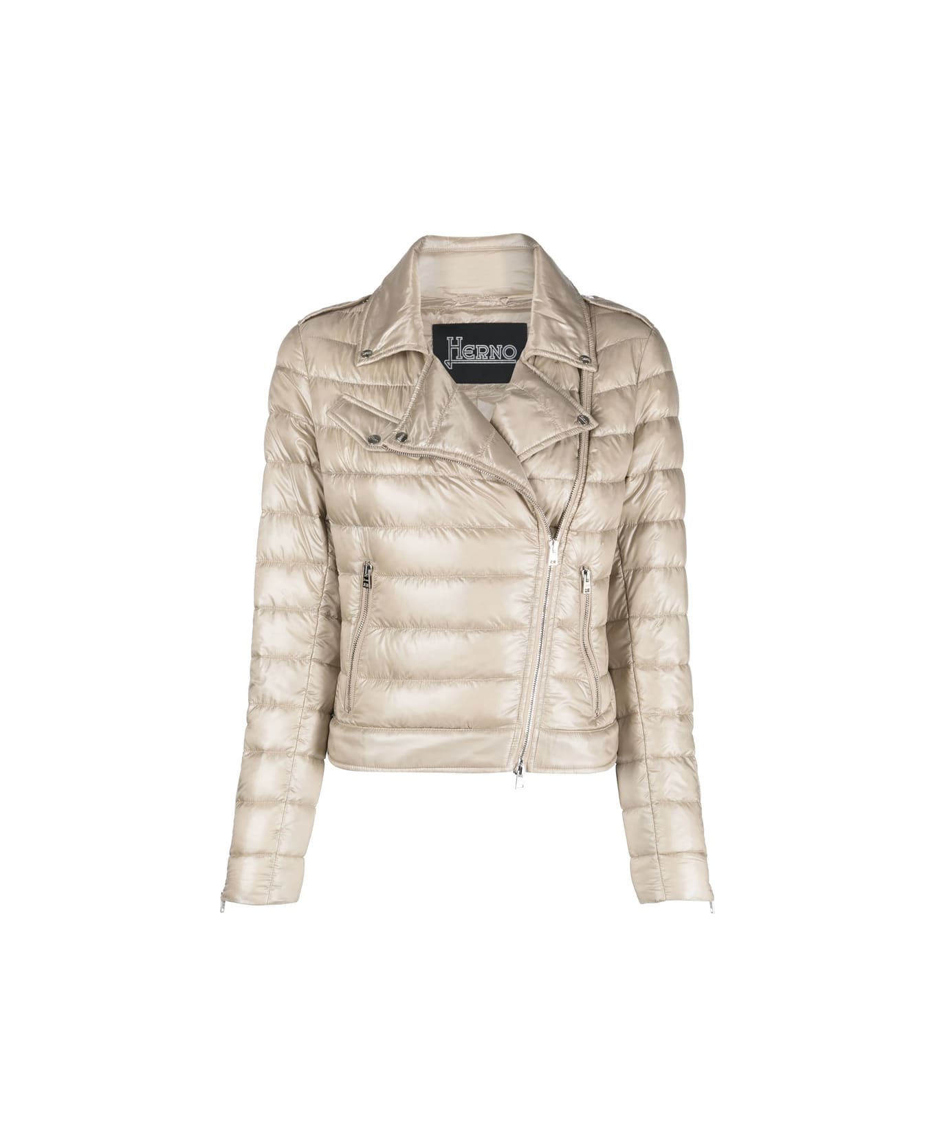 light beige down-feather filling padded design silver-tone hardware notched collar front zip fastening long sleeves cuff zips chest flap pocket two side zip-fastening pockets full lining straight hem