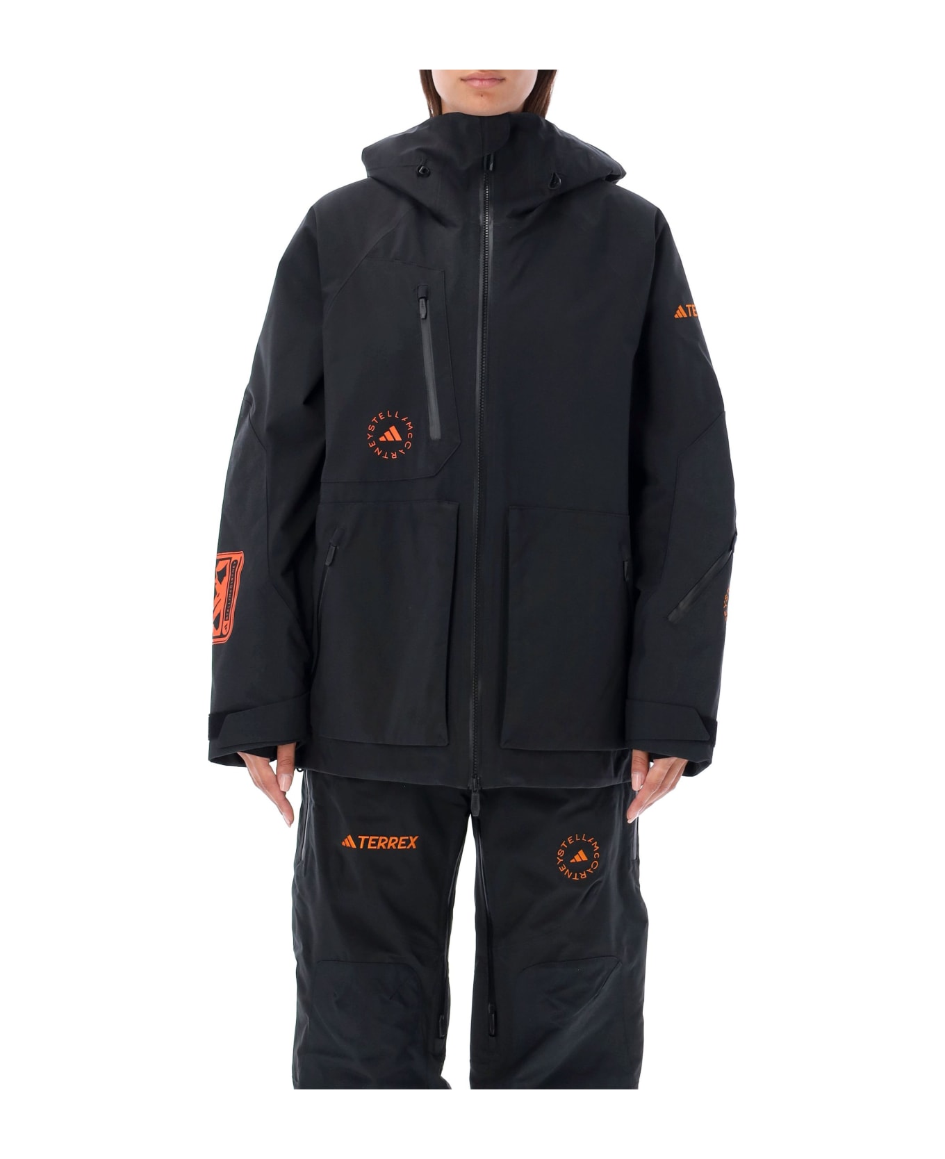 Ski Jacket By Adidas By Stella Mccartney. Featuring: Elasticated Hood Long Sleeves Central Two-way Zip Closure Printed Logo At Chest Zip Pockets At Front Elastic Cuffs Velcro Straps At Wrists Embroidered Logo At Left Sleeve Printed Logo At Right Sleeve Zip Pocket At Left Sleeve Lateral Zip Openings Inner Pockets Detachable Elastic Waistband Inside Printed Logo At Back Model Is 1,72 M Tall And She Is Wearing Size S Model Is 1,90 M Tall And He Is Wearing Size L