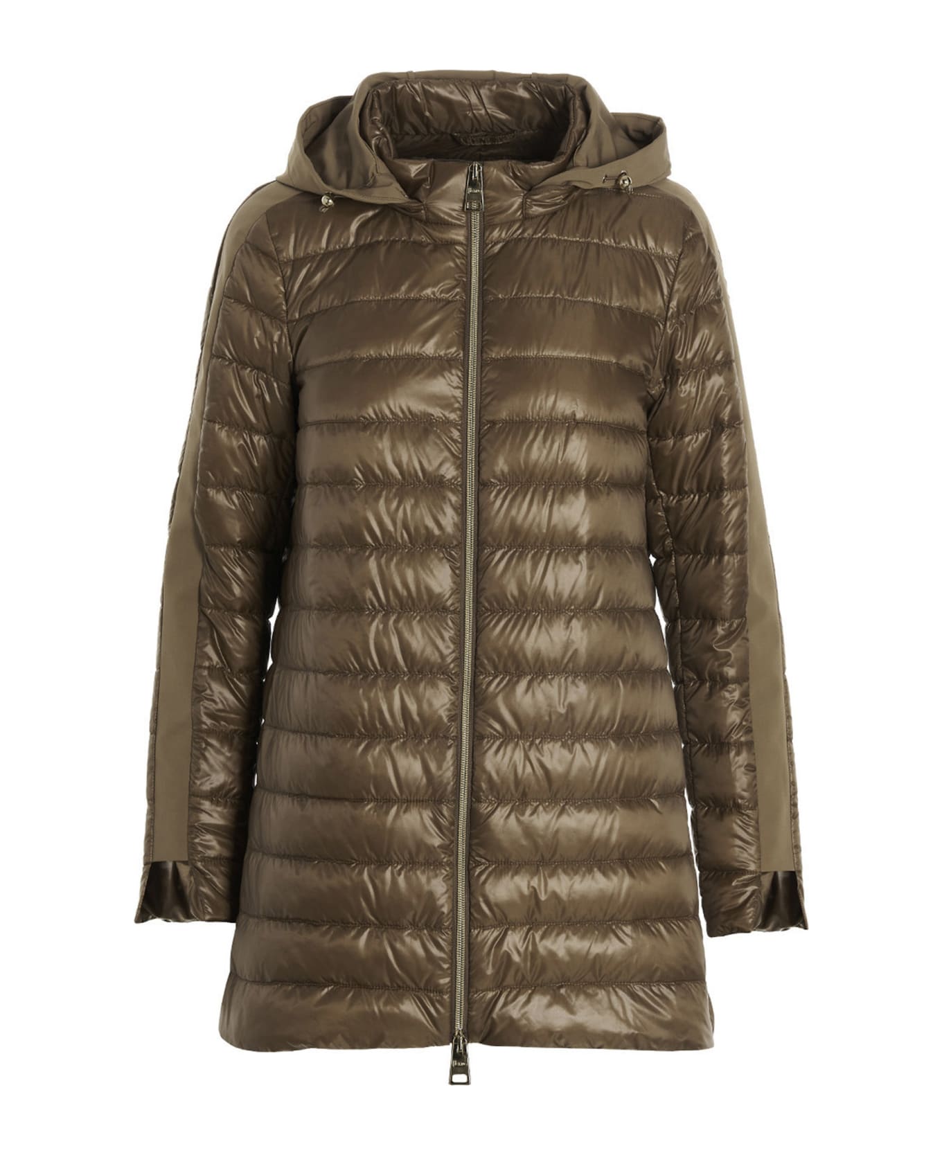 'A-Shape' ultralight nylon jacket with goose down padding, removable hood with drawstring, band detail on the sleeve, full zip closure. ure. Composition: 100% polyamide