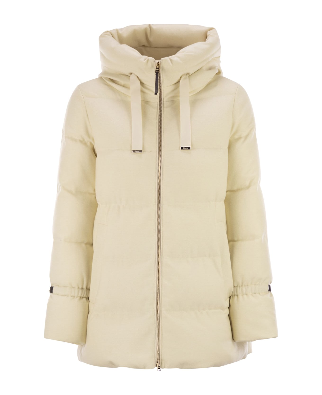 Fine wool jacket crafted with a bi-stretch weave with a textured look that combines performance, comfort and elegance. A snug fabric that adapts to the body's movements, embellished with bright lurex inserts. Cosy and versatile, the model is finished with soft down padding and a grosgrain drawstring hood. - Regular fit - Striped quilting - Down padding - Grosgrain drawstring hood - Side welt pockets - Herno metal logo on the back - Double-slider zip closure DESIGNER ID: PI002104D33467 1100