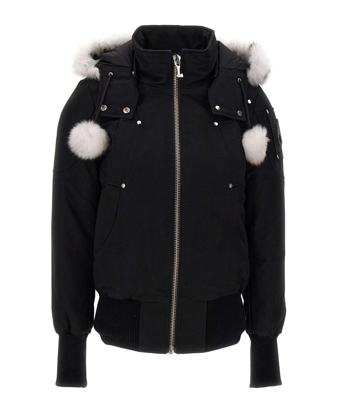 Moose Knuckles "Debbie Bomber" women's down jacket, black, resistant cotton/nylon and powerful 80/20 down, removable hood with fur trim and drawstring with pompom, front closure with silver logoed zip, ribbed knit edges, side J pockets, slanted handwarmer pockets, iconic metal logo patch on left sleeve, protection rating - Level 4 Canada Cold, slim fit.