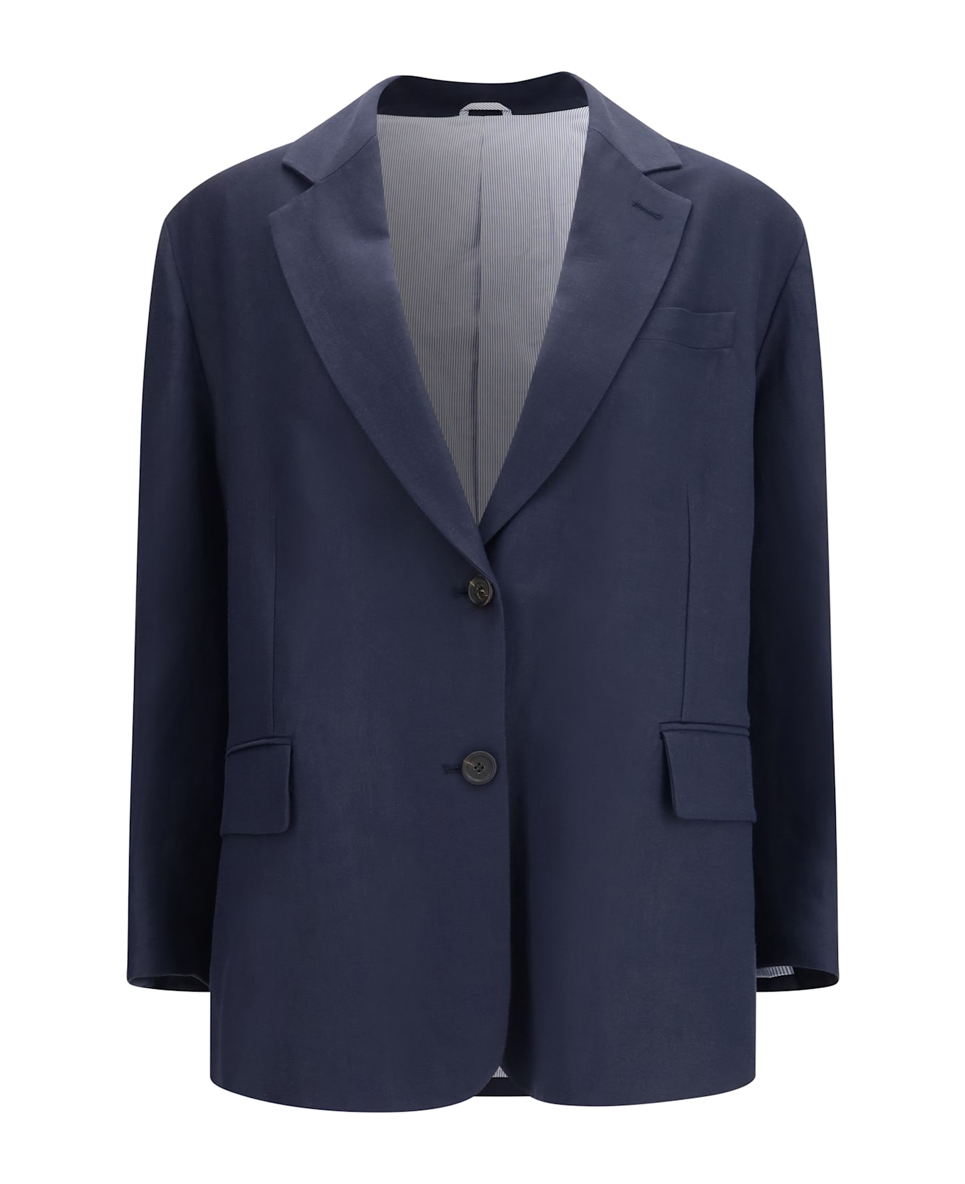 The fluid viscose and linen twill jacket by brunello cucinelli reimagines menswear-inspired tailoring with lightness and modern elegance. classic lapels shape a clean, refined silhouette, while two flap pockets and a welt pocket provide balanced functionality. the two horn buttons, echoed on the cuffs, add a distinctive sartorial detail, making this jacket perfect for a polished yet effortless look.