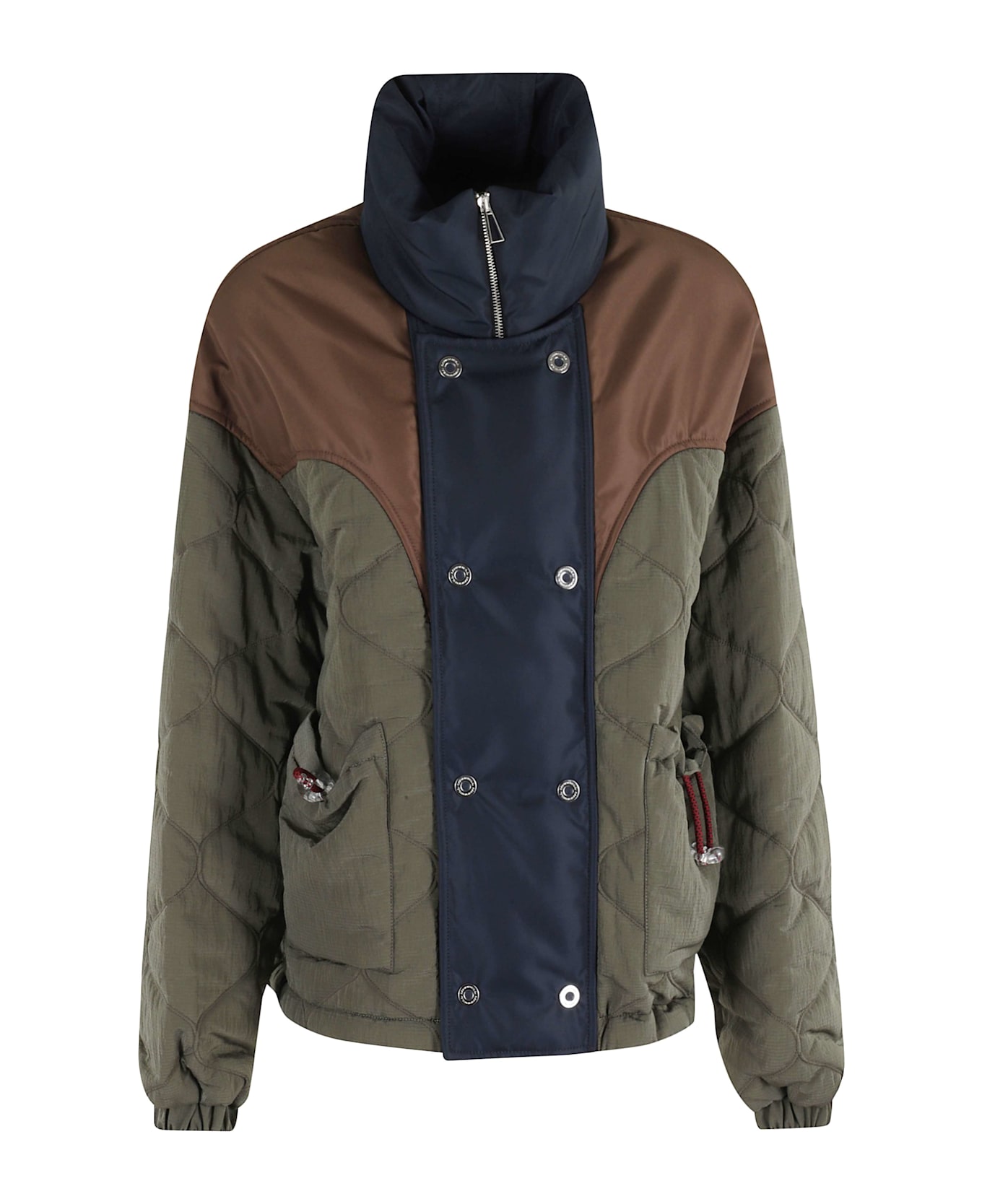 Kate jacket - Marbell - Olive color - Quilted nylon fabric - Contrast high collar - Maxi side patch pockets with drawstring - Front zipper and button closure - Over fit