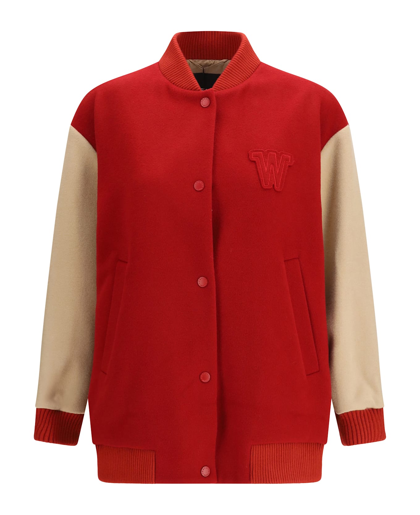 The oversized bomber by weekend max mara is crafted from hand-sewn double wool and stands out with a w patch on the chest and weekend 83 lettering on the back, highlighting its contemporary varsity inspiration. it features a ribbed knit collar, cuffs, and hem, while the contrasting long sleeves with dropped shoulders enhance its relaxed silhouette. the front snap-button closure ensures practicality, complemented by side welt pockets. a quilted interior provides warmth and comfort, making it perfect for the season.