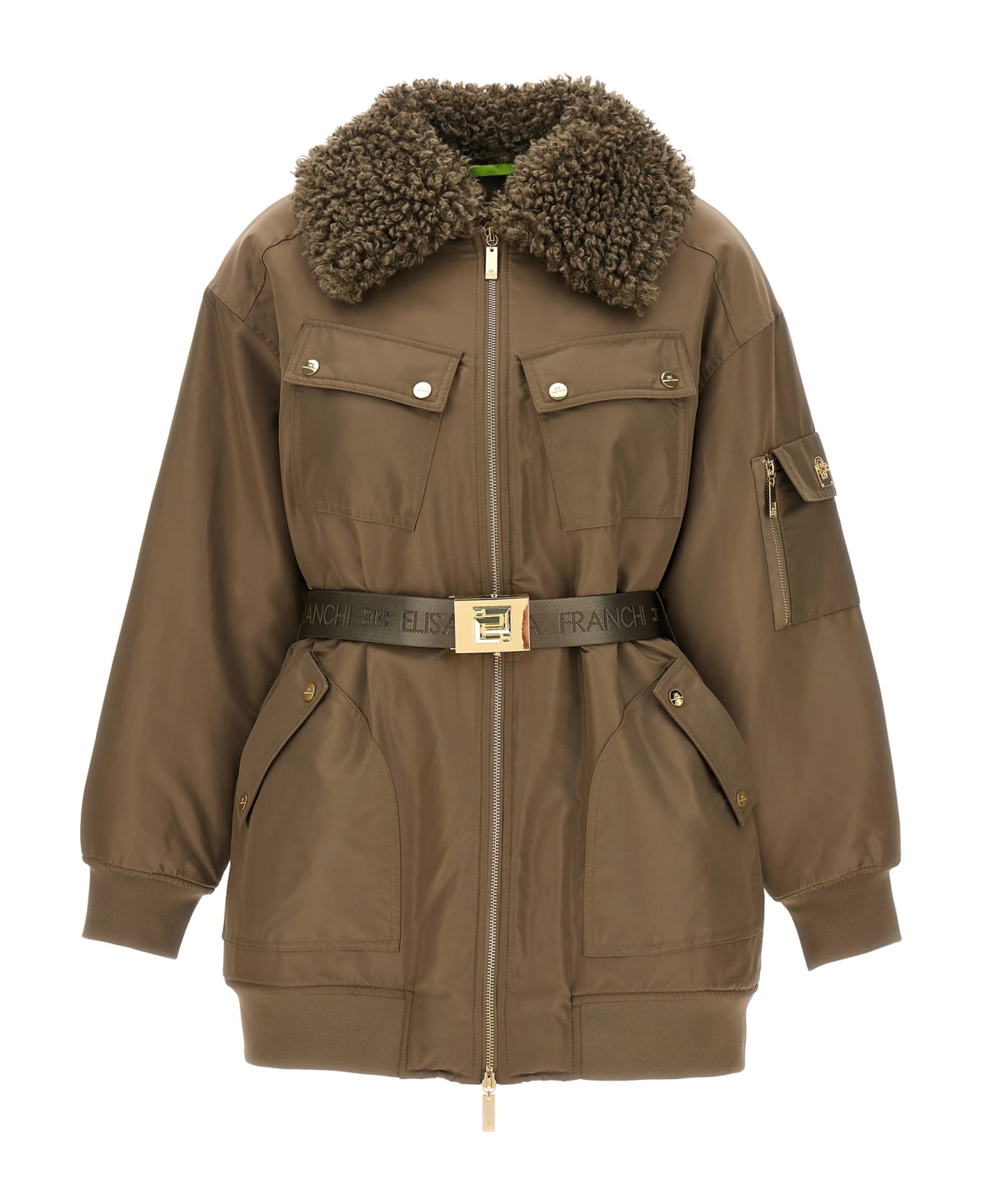 Nylon parka with removable waist belt and zip closure, shearling collar detail, pockets, long sleeves with knitted cuffs.