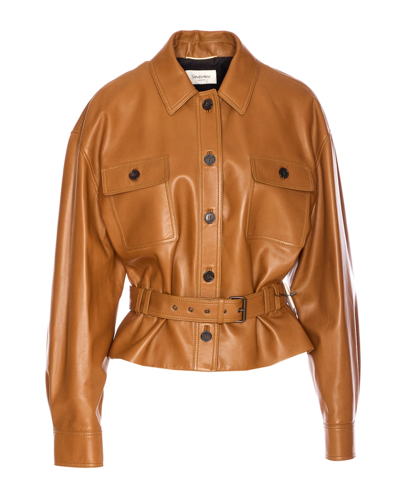 Short safari style jacket with buttons and pointed collar, gathered waist with belt, dropped shoulders and puff sleeves Composition: 100% Lambskin, 100% Silk
