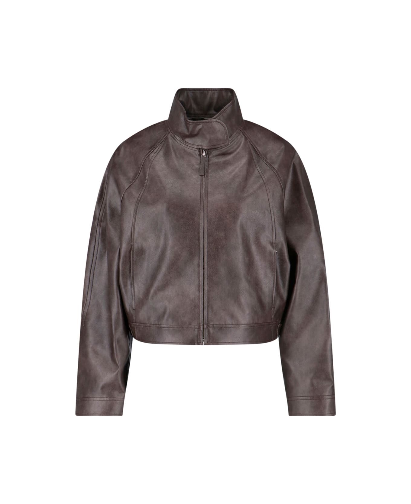 Low Classic 'Stand Collar' brown faux leather jacket with high neck, zip closure, long sleeves, two side zip pockets.
