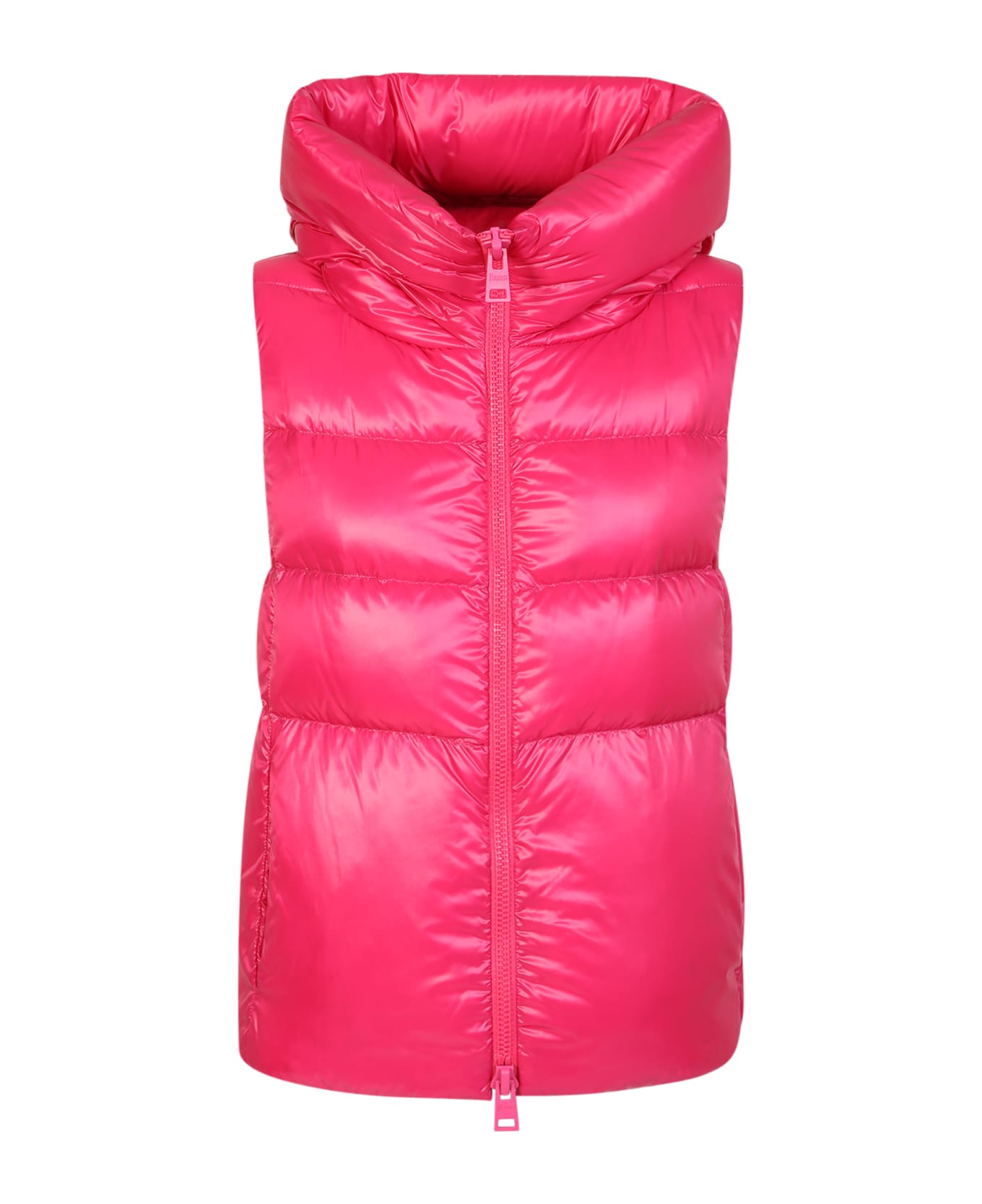 Classic hood. Sleeveless. Quilted. Padded design. Front zip fastening. Color: pink