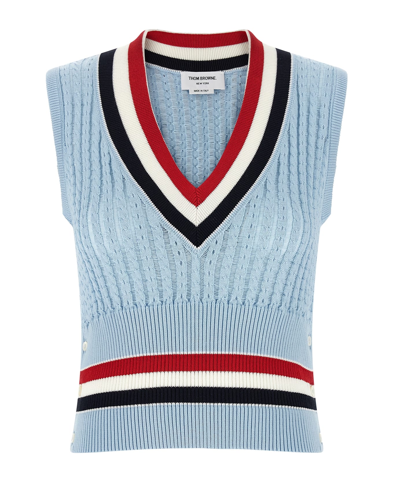 Crochet cotton waistcoat with braids, slightly cropped model, V-neck in ribbed 'RWB' knit, ribbed band on the hem with 'RWB' intarsia and side slits with buttons.
