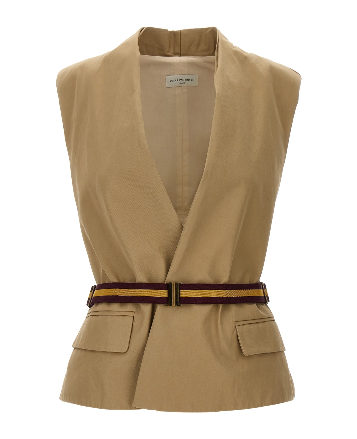 'Vilian' cotton vest with padded shoulders, pockets, adjustable elastic belt at the waist.