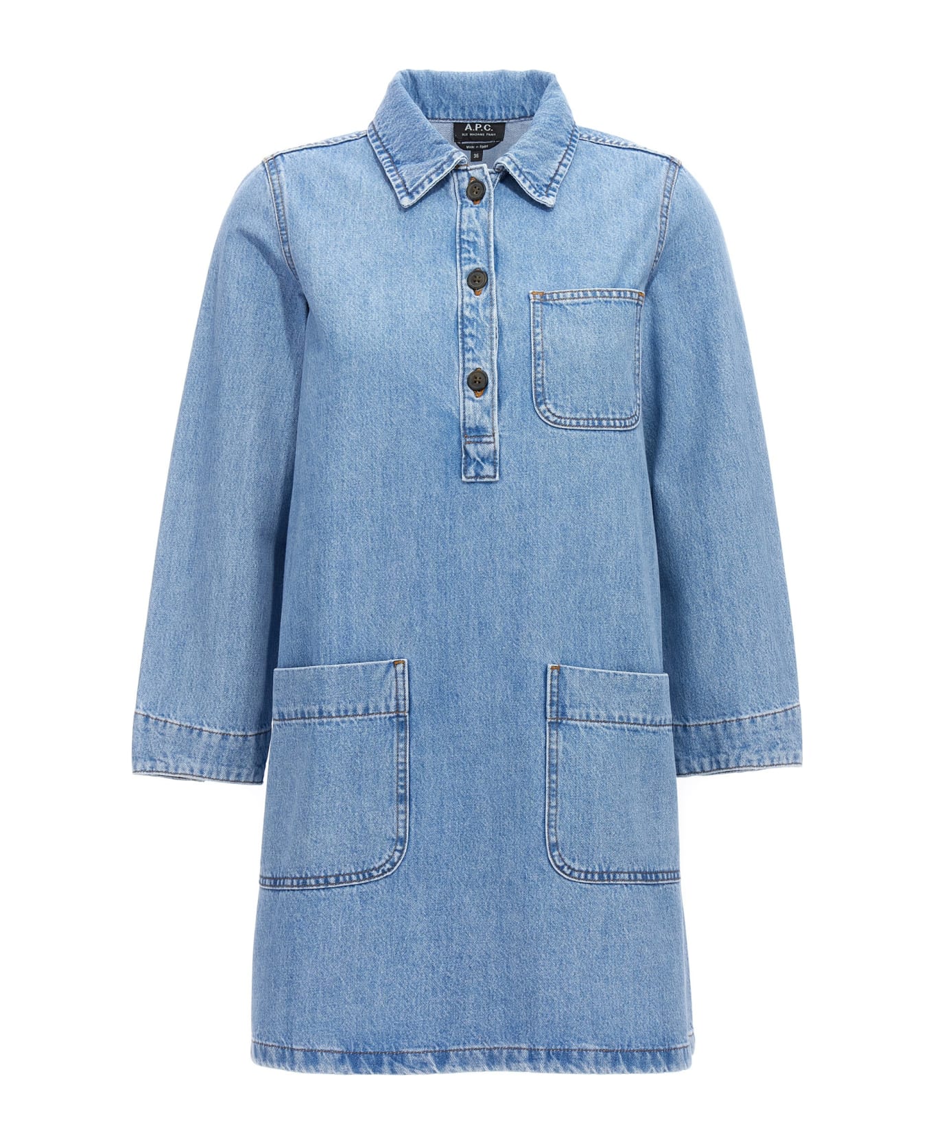 Aurelia dress in light blue washed cotton denim with pockets, and long sleeves.