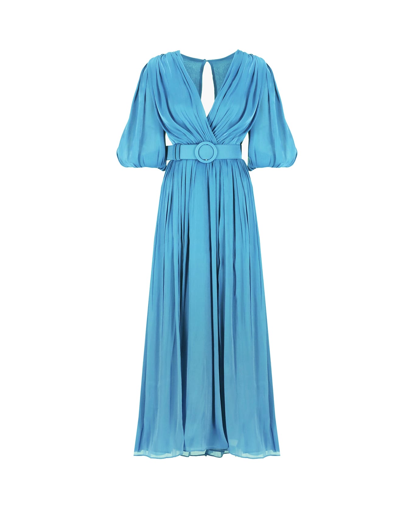 - Turquoise Costarellos lurex georgette dress for woman - Deep V- neck - Short balloon sleeves with cut-out detail - Elastic waist - two front vents at hem - Rear button and zip fastening - Bare back - Matching belt included
