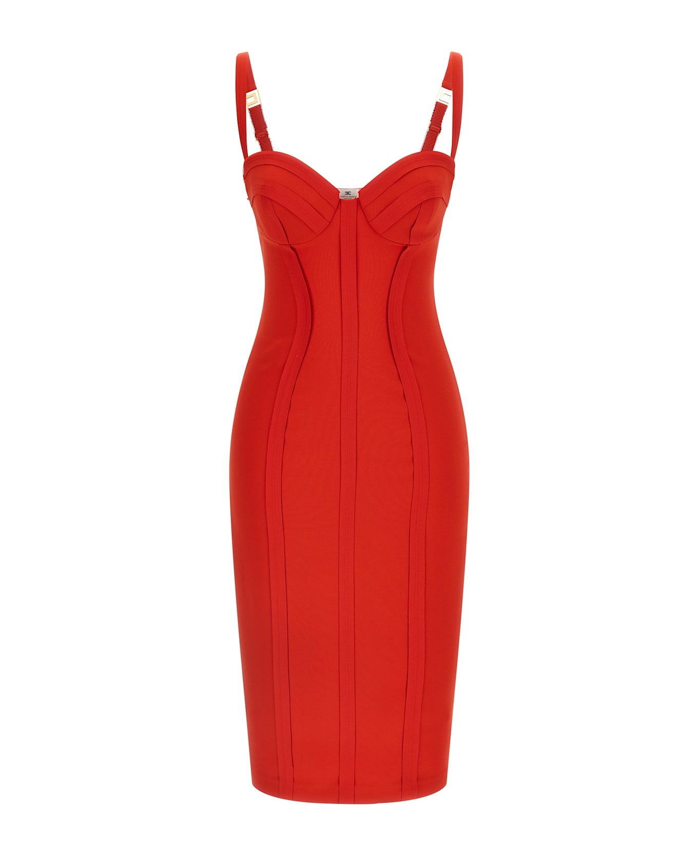Light crêpe midi dress, bustier construction with pre-shaped cups, inner bra with back hook closure, sweetheart neckline, thin adjustable straps with metal logo detail, back split, side zip closure. Composition: 95% polyester, 5% elastane