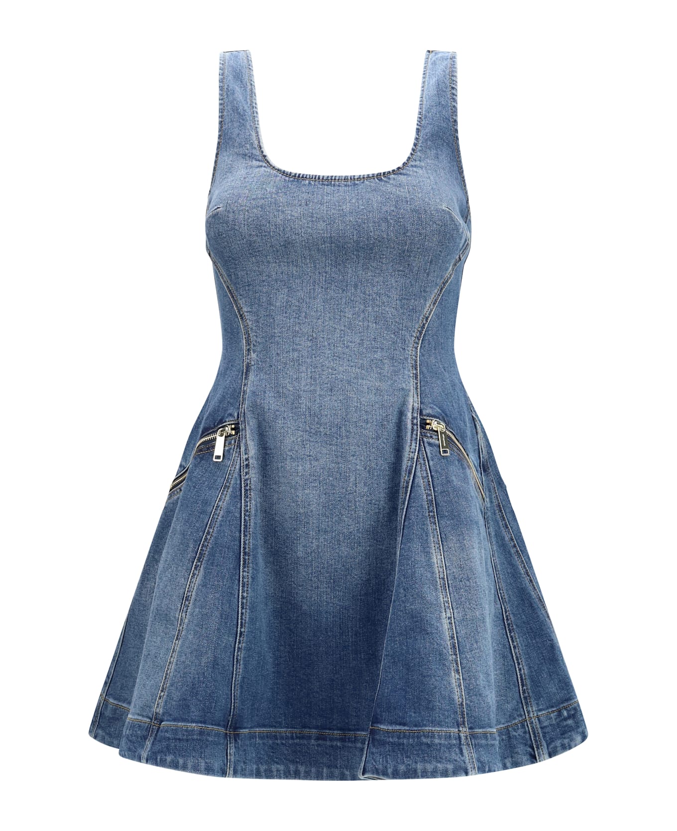 The denim flared mini dress by self-portrait features a silhouette with a full flared skirt that adds movement and definition to the line of the garment. the construction is enhanced by visible topstitching that highlights the structure of the model and emphasizes its bold character. the low-cut back and the exposed zip closure on the back introduce a contemporary detail, while the functional pockets complete the design combining style and practicality.
