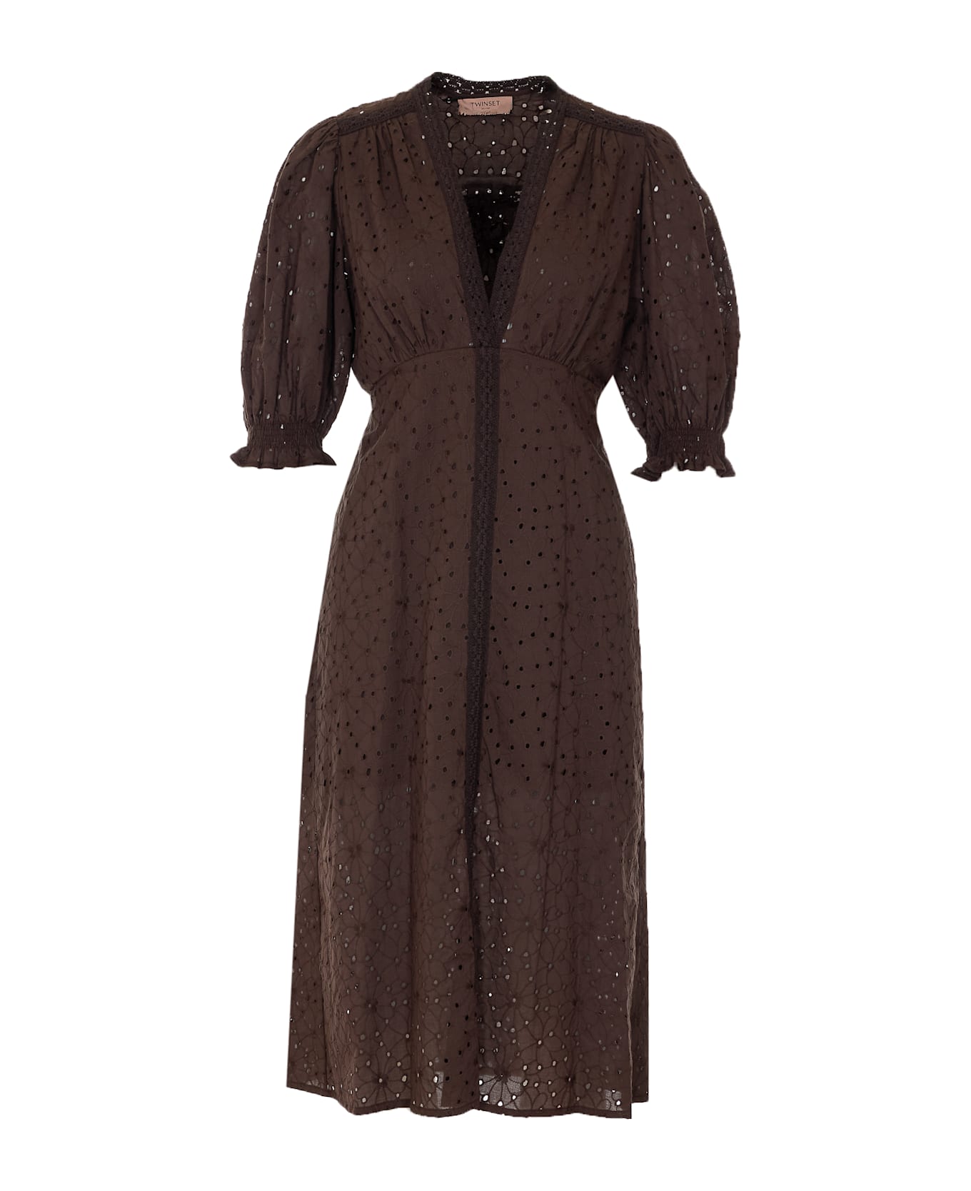 Twinset brown dress, V-neck, 3/4 sleeves, embroidered detail, midi model Composition: 100% Cotton, 100% Cotton
