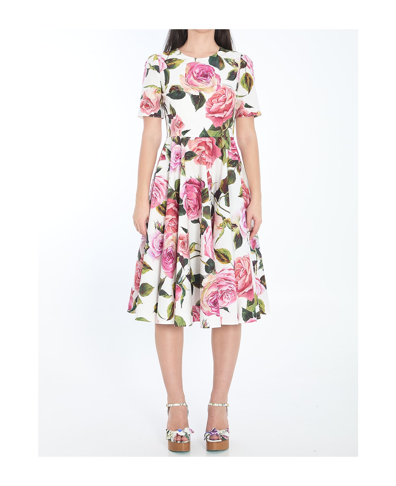 Midi short-sleeve dress in cotton with an all-over floral print. It features a round neckline, a Dolce & Gabbana logo on the chest, a back zip and hook closure, and a flared skirt. The model is 176cm tall and wears a size IT 40.