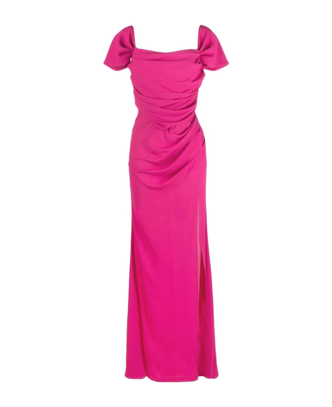 Fuchsia pink evening gown, ruched detailing, drop shoulder, square neck, rear zip fastening, thigh-high side slit, central rear vent, straight hem Composition: Polyester, 100%