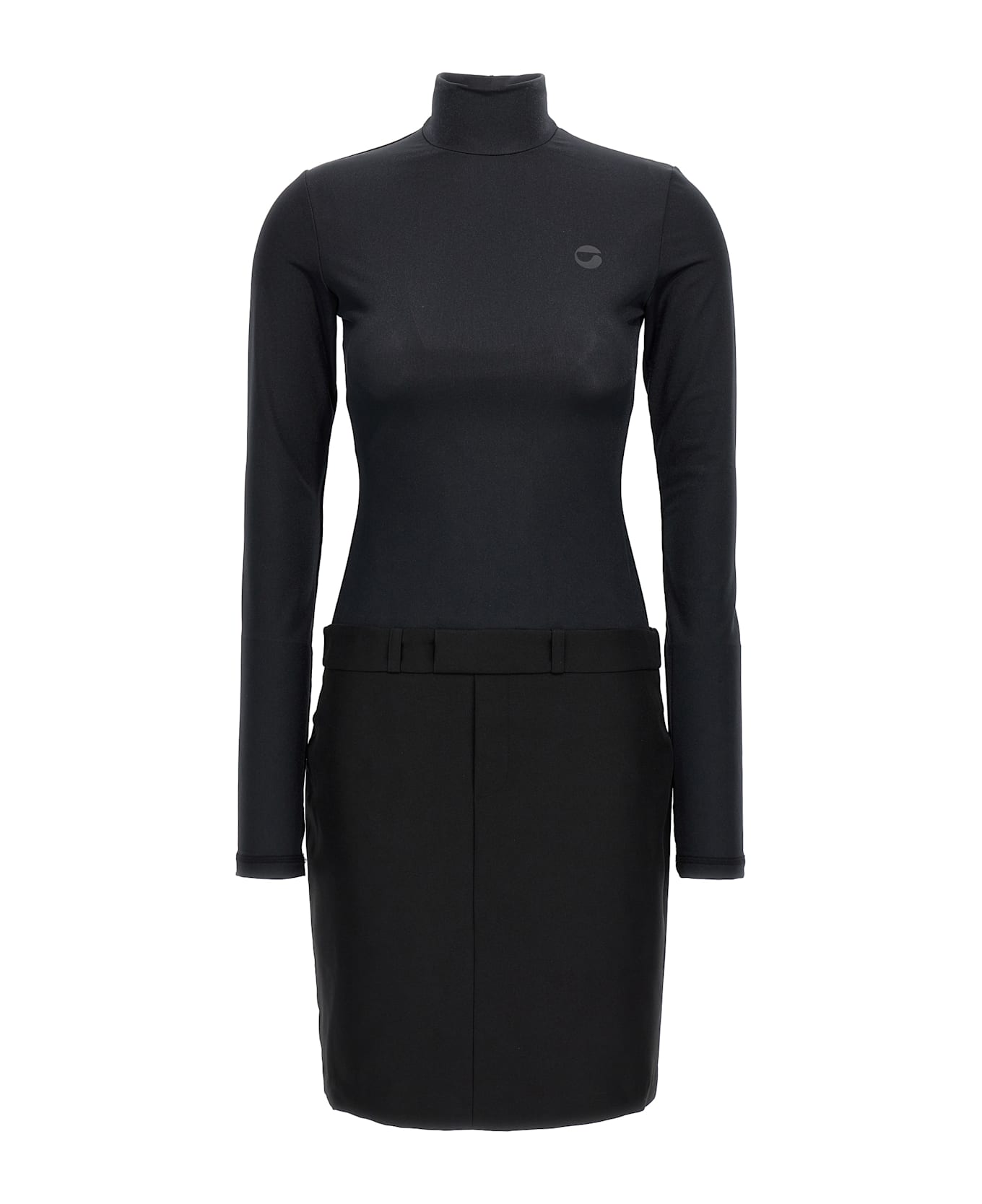 Hybrid' dress with tech fabric sweater with high neck and long sleeves with thumb room and skirt with trompe l'oeil details. SUSTAINABLE: Product made from recycled polyester.