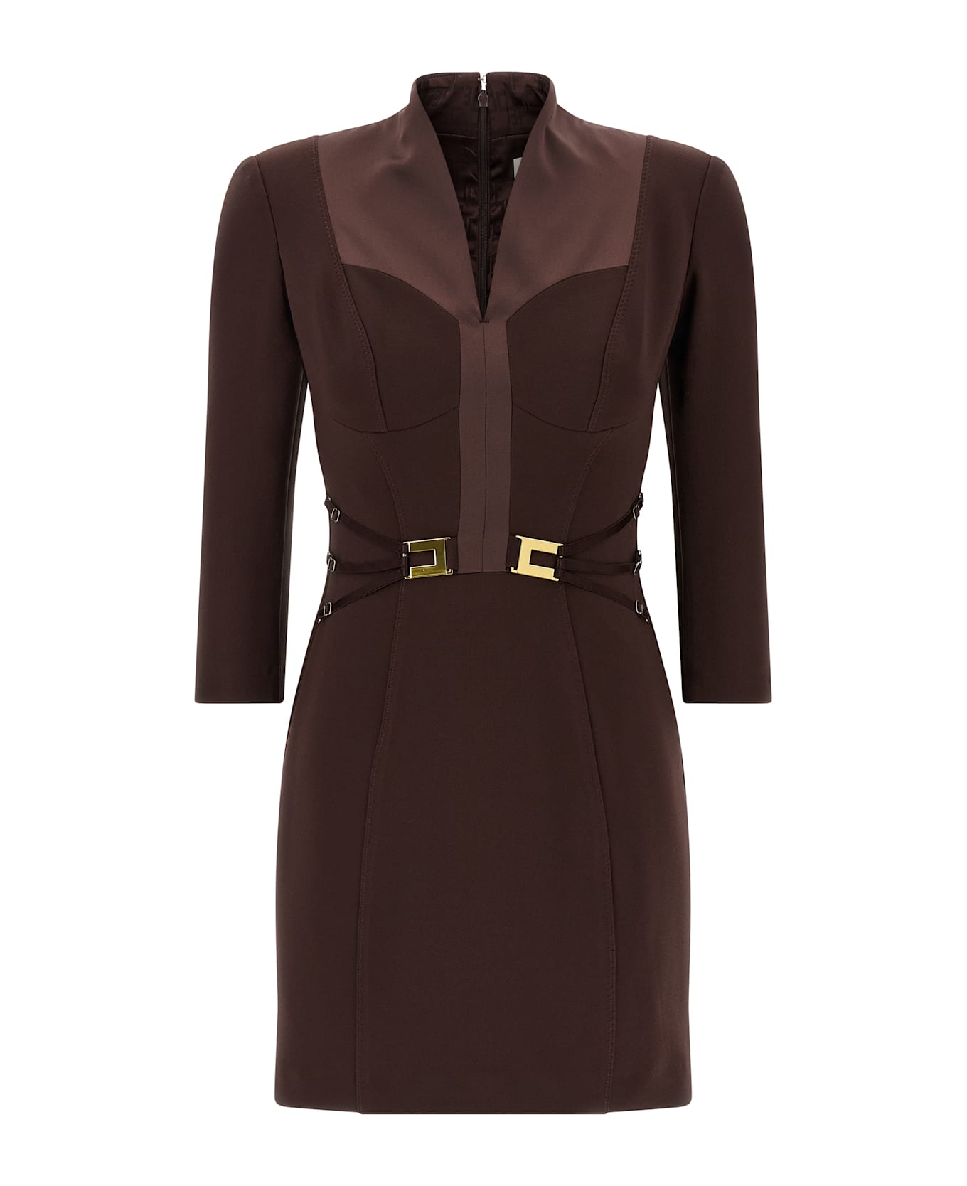 Double stretch crêpe mini dress, metal logo detail with adjustable elastic waistbands, corsetry-inspired model with front cups and zigzag stitching, tone-on-tone satin V-mount, structured shoulder straps, 3/4 sleeves, back zip closure, monogram satin lining.