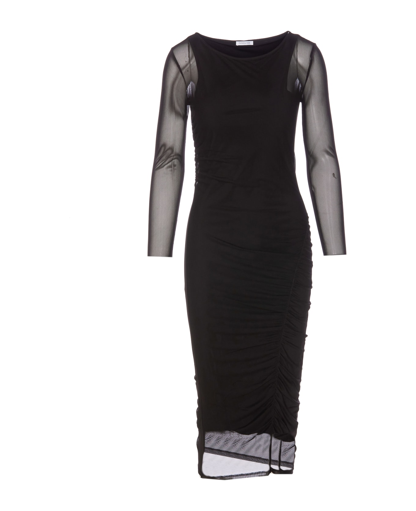 Patrizia Pepe black long dress, long sleeves with transparent effect, with petticoat, back logo, ruched,
