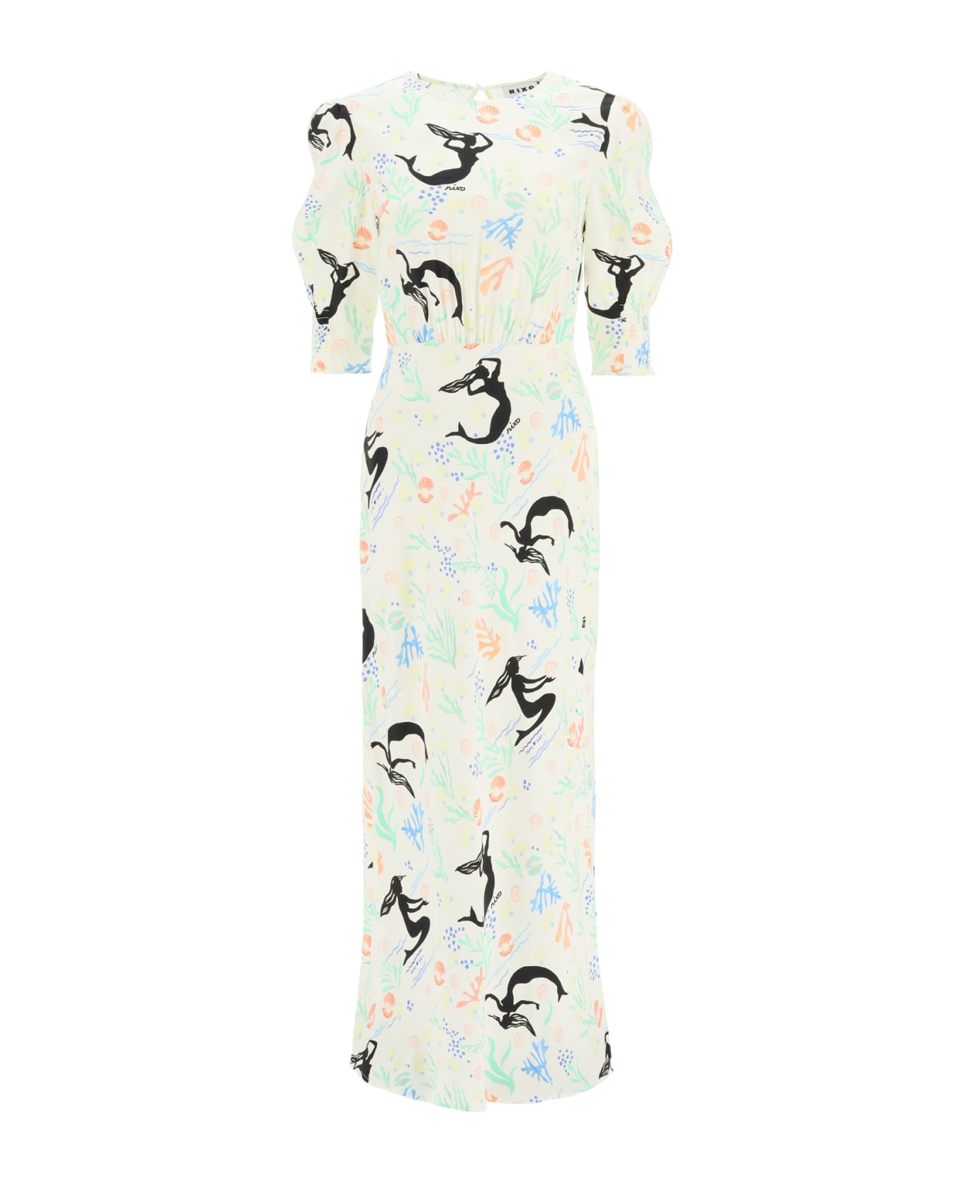 RIXO LONDON long dress in crêpe envers satin with all-over "mermaids and shells" motif. Waist cut, puff sleeves, flowing skirt with flared hem. Back teardrop closure and invisible side zip. The model is 177 cm tall and wears a size XS. Composition: 100% viscosa