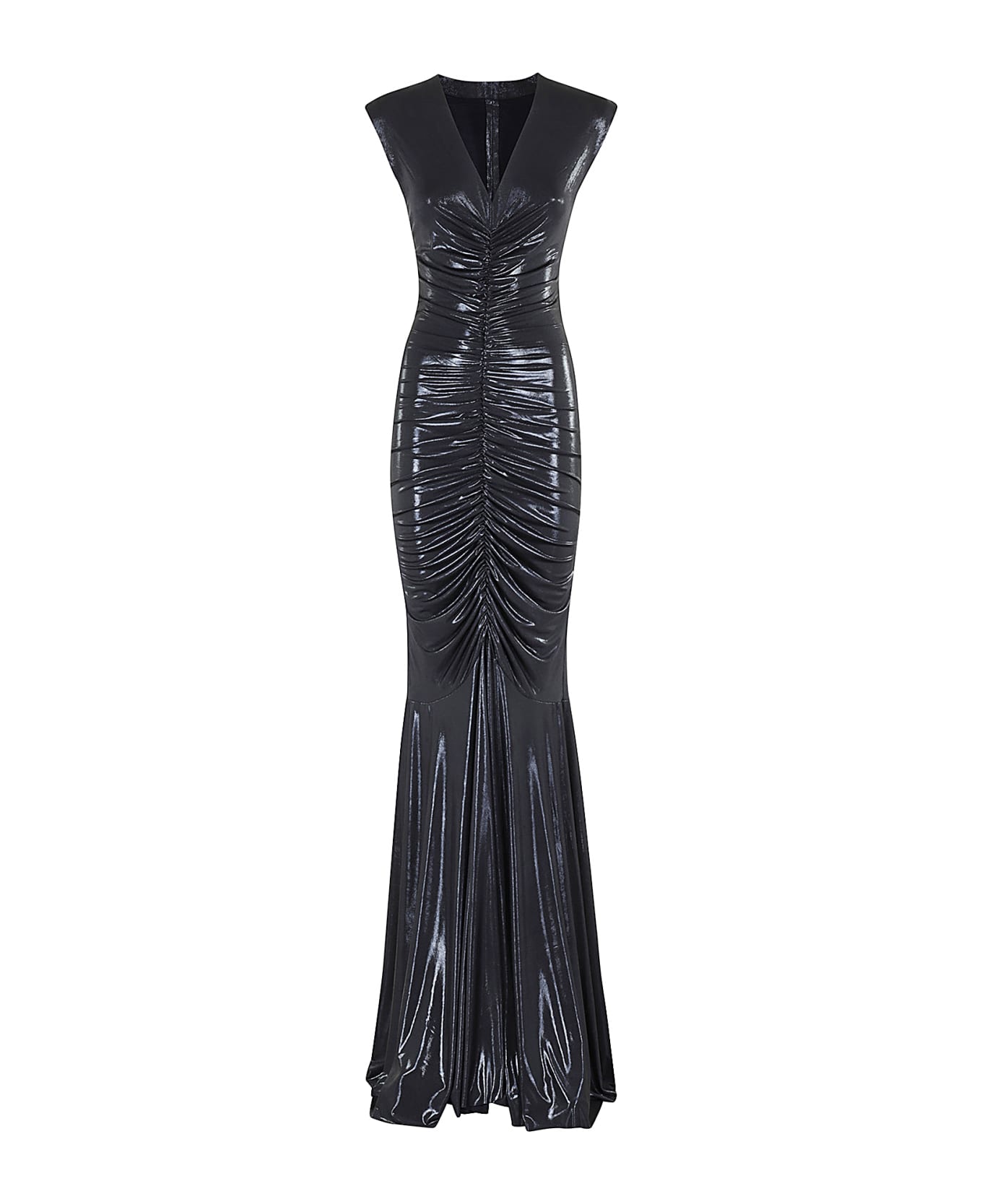 Deep V dress - Norma Kamali - Metallic blue color - Stretch fabric - V-neck - Sleeveless - Draped design - Fitted fit - Toe length with mermaid hemline