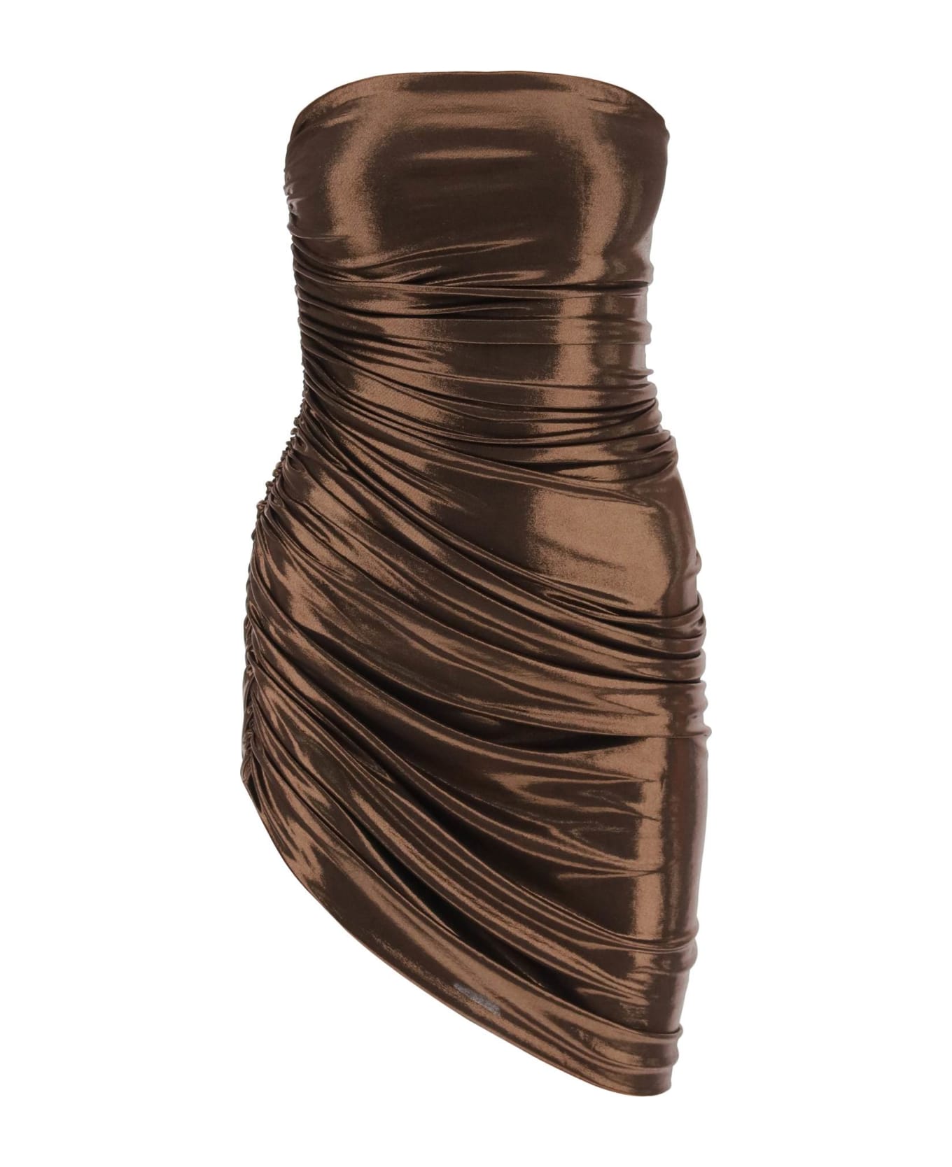 This strapless version of Norma Kamali's Diana mini dress is crafted of lamé jersey. It features a straight neckline and asymmetric hem. Internal jersey bodysuit. The model is 177 cm tall and wears a size XS. Composition: 95%PL, 5%EA