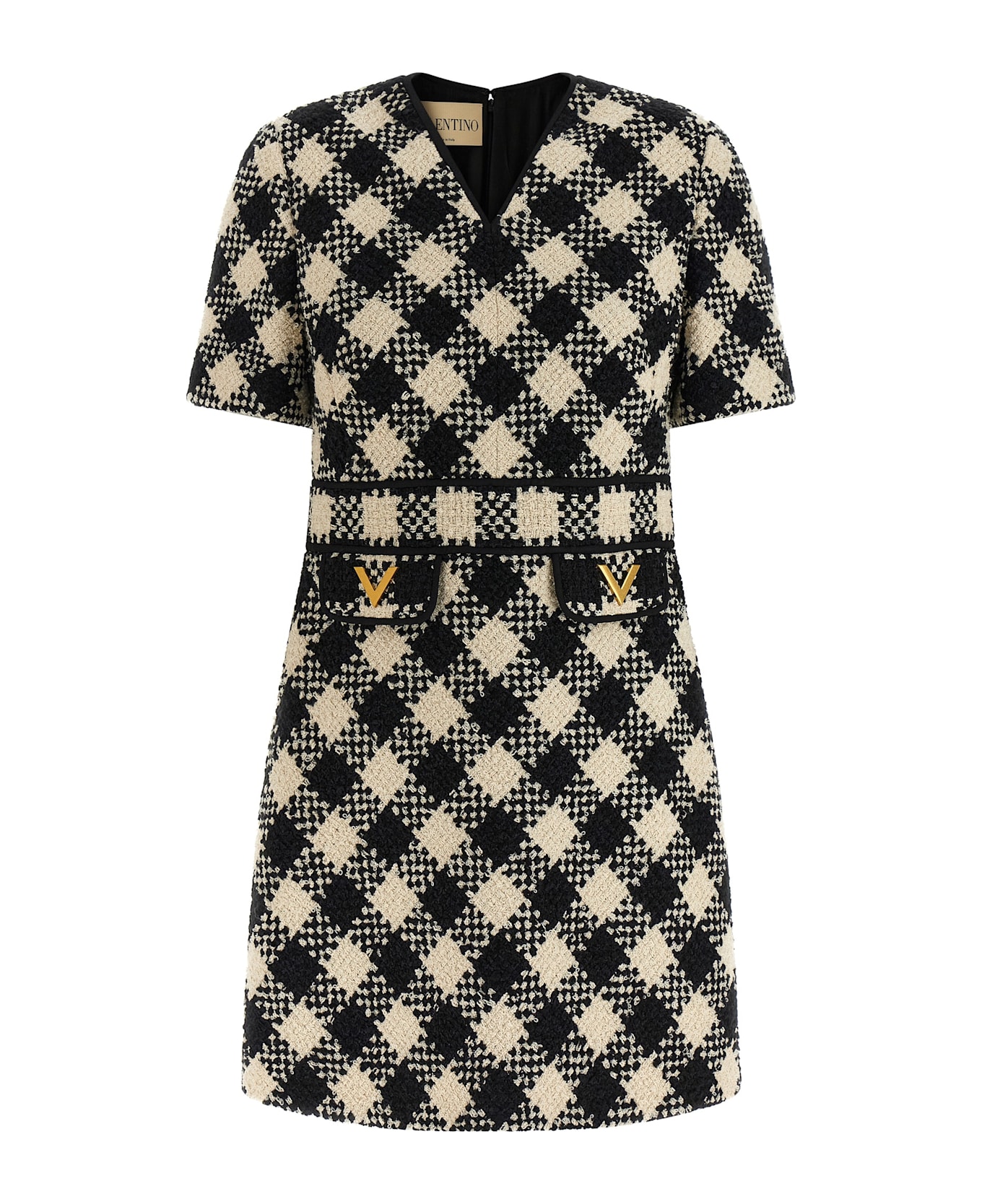 Damier Tweed mini dress, V-neck, trompe l'oeil pockets with antiqued effect metal 'V Gold' detail, hourglass silhouette, short sleeves, back zip closure, Fiore, Stripe and VLogo lining in silk blend. Composition: 44% cotton 18% wool 16% viscose 12% acrylic 8% polyamide 2% mohair wool
