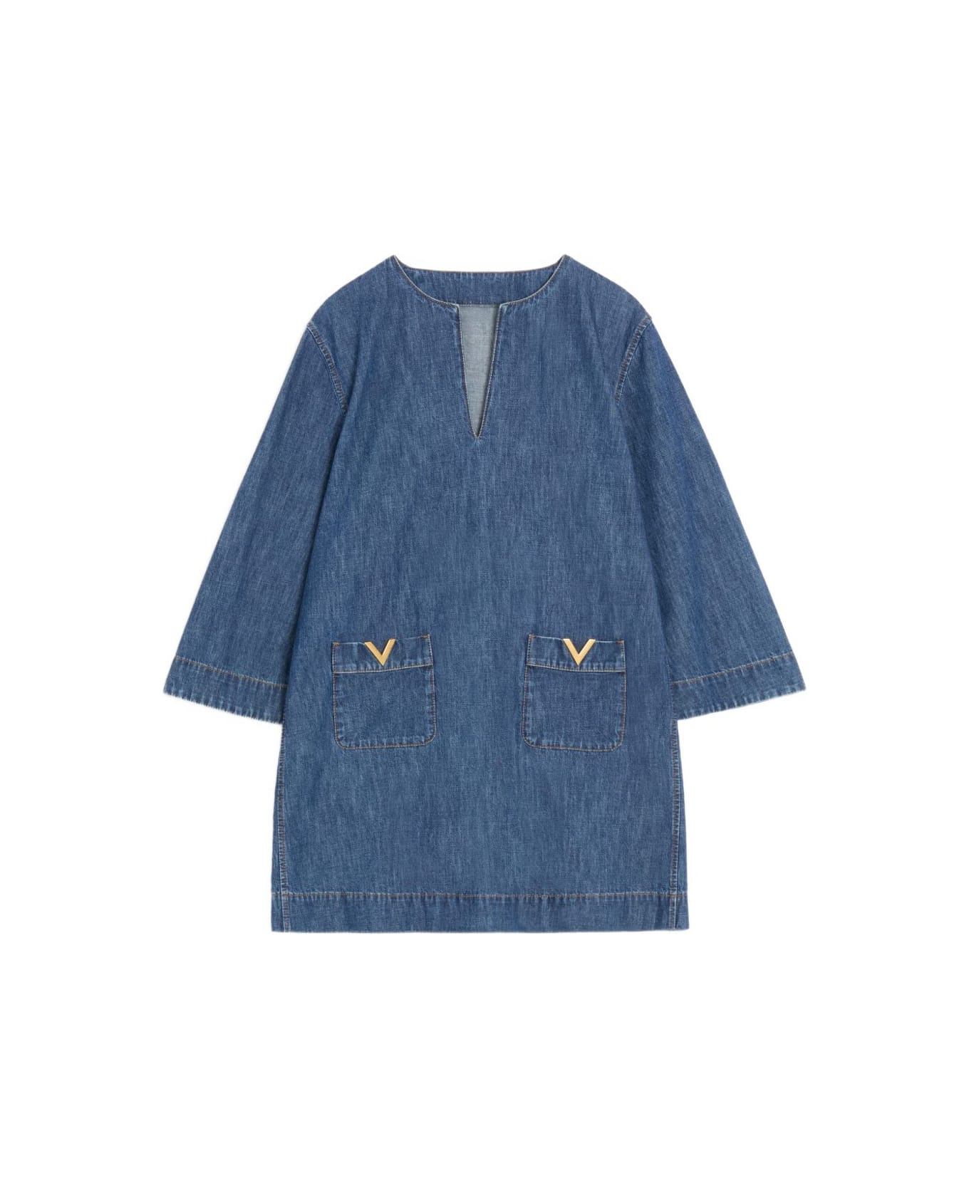 Valentino dress blue V-neck three-quarter sleeves patch pockets logo detail The full look includes Valentino Garavani accessories. Composition: Cotton, 100%