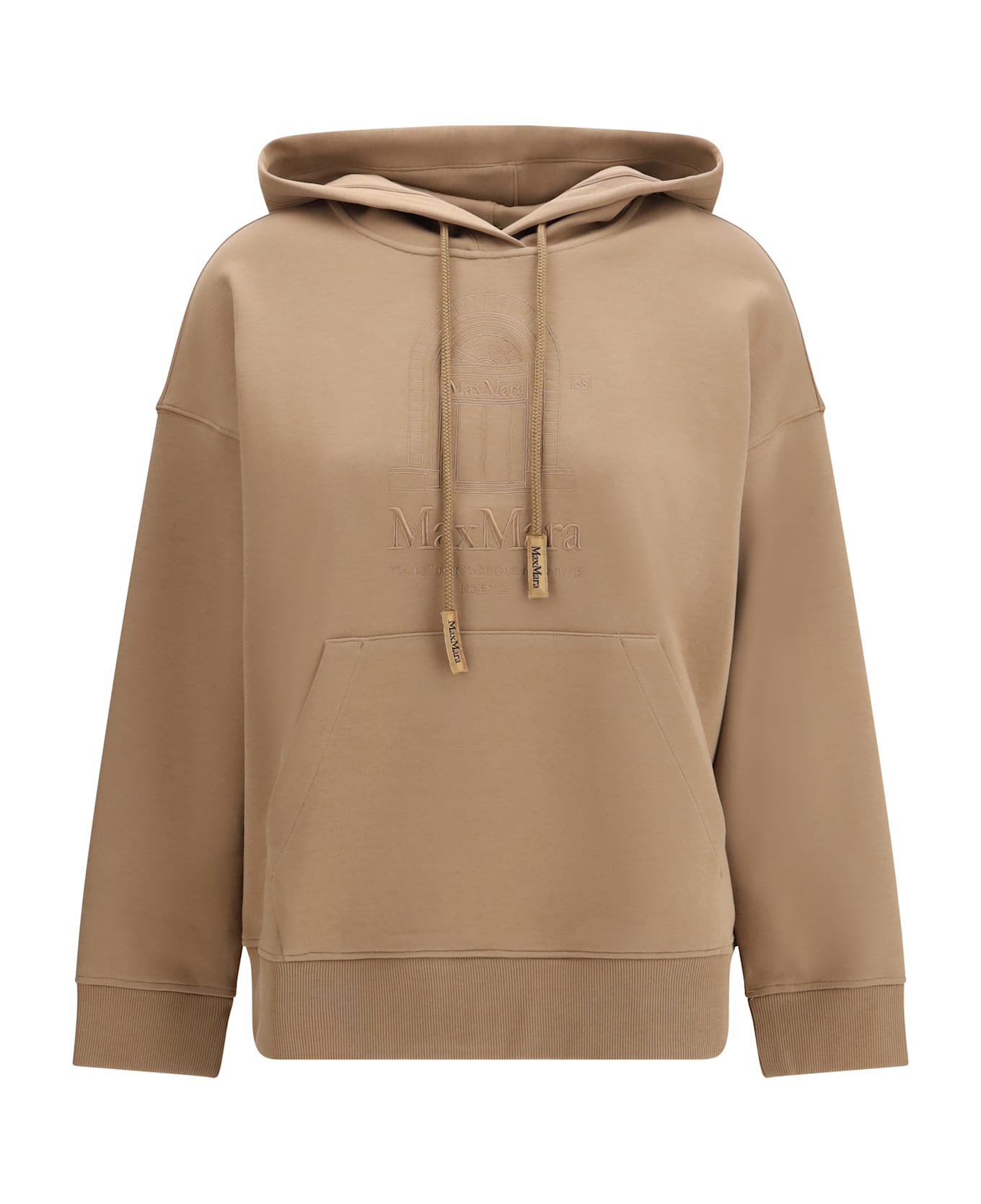 The andrea hoodie by s max mara in cotton blend is a casual yet sophisticated piece, perfect for a comfortable yet stylish look. the drawstring hood allows for an adjustable fit, while the kangaroo pocket adds practicality and comfort. the embroidered logo on the front adds a distinctive and classy detail. the ribbed cuffs and hem complete the design, ensuring a perfect fit. ideal for a relaxed urban outfit, this sweatshirt combines quality and style.