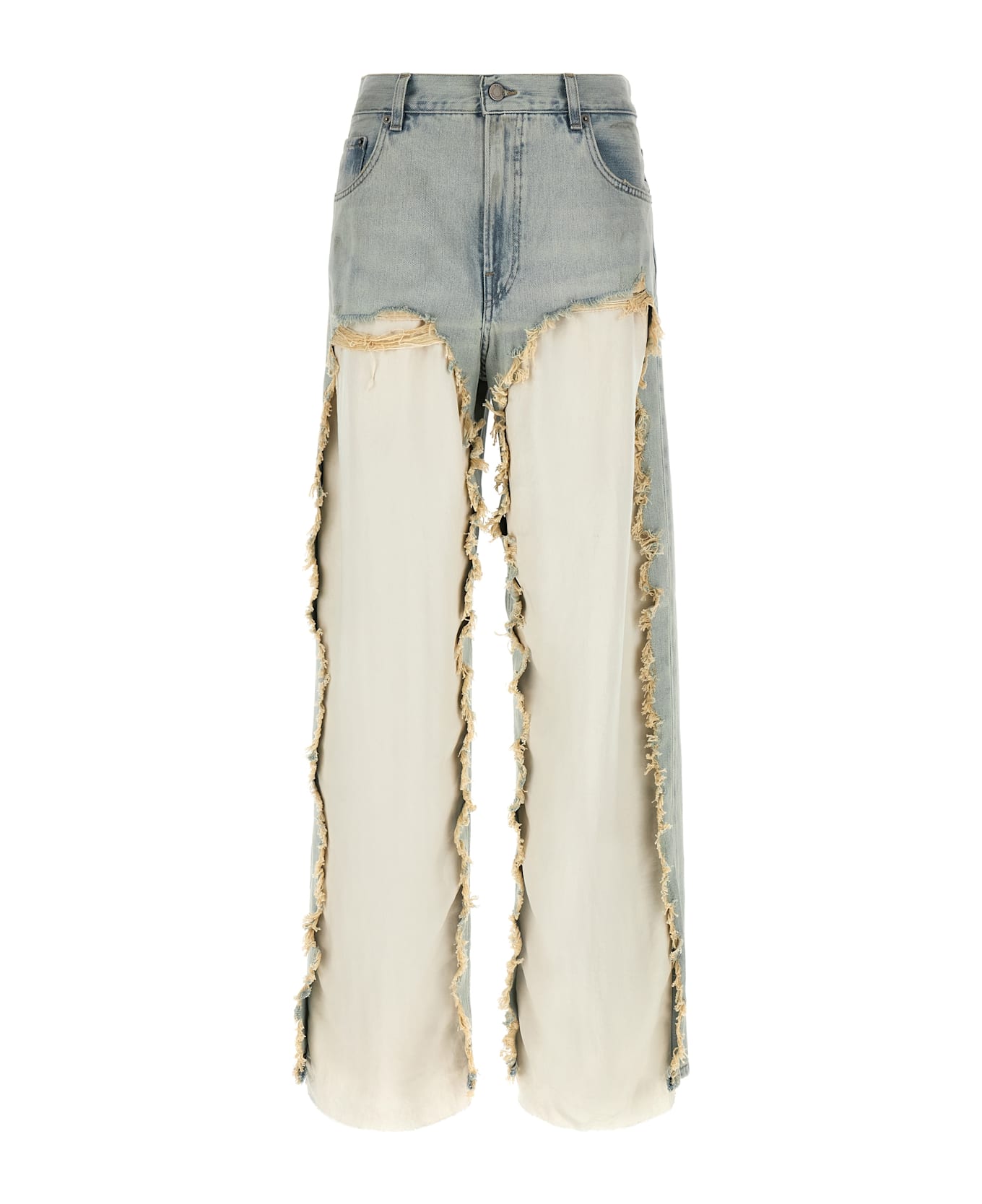 Bull 'Bonnie' used-effect cotton denim jeans with front breaks and rips with tonal satin insert, wide flared leg, front zip and button closure, five pockets, back logo tag, and asymmetric leg bottom.