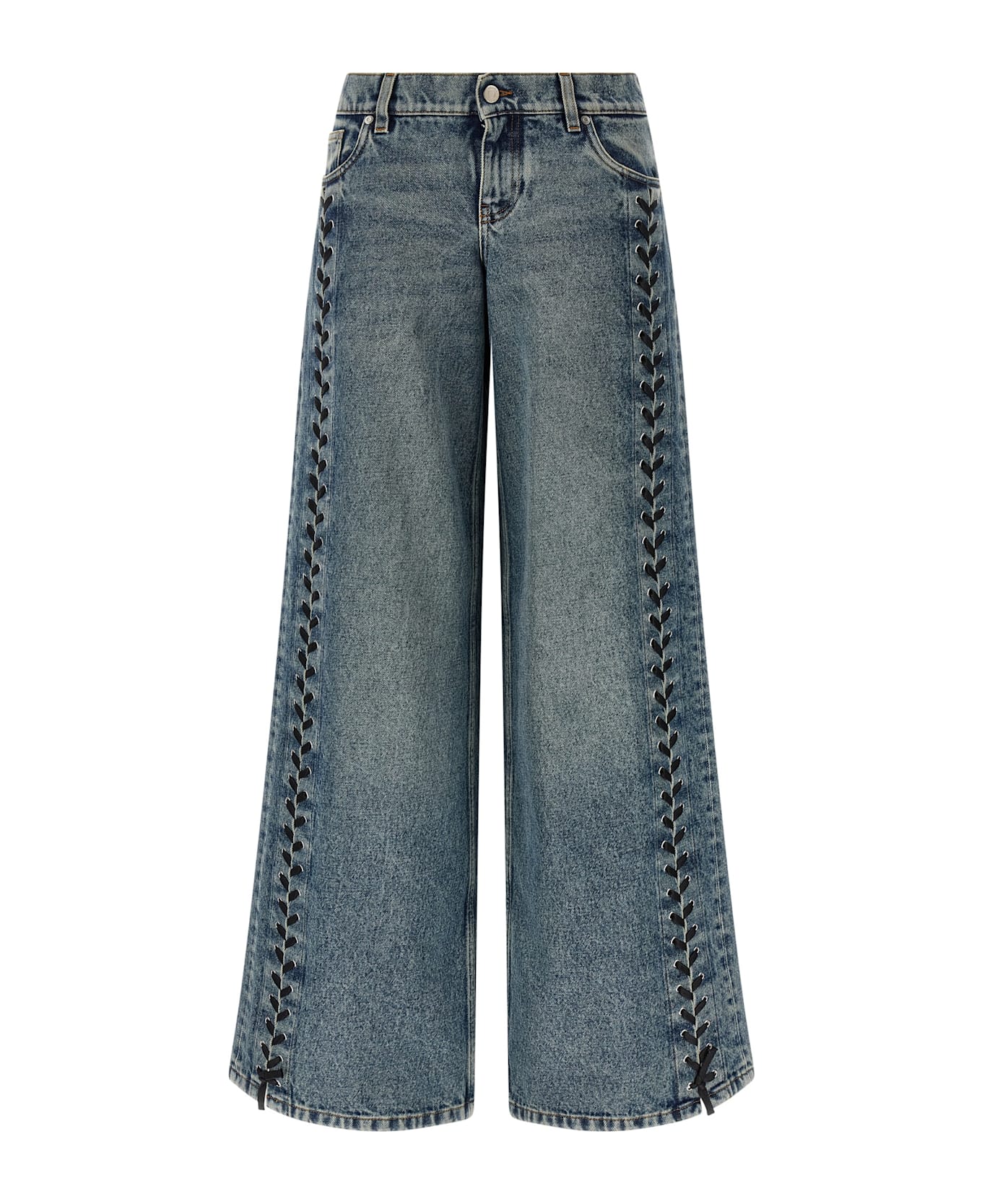 Cotton denim jeans, 5-pocket model with medium waist, wide leg, lace detail with woven pattern with metal eyelets inspired by corsets, loops at the waist, front button and zip closure. Composition: 100% cotton