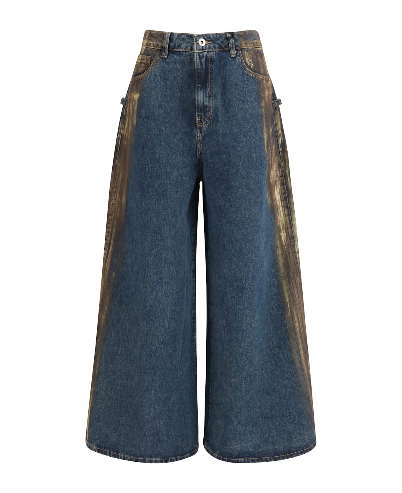 The oversized jeans by ella, featuring belt loops and contrasting painted details running along both sides. they are designed with a single-button and zip closure, two front pockets, and two back pockets. the relaxed fit combined with the artistic side accents gives the piece a contemporary and unique character.