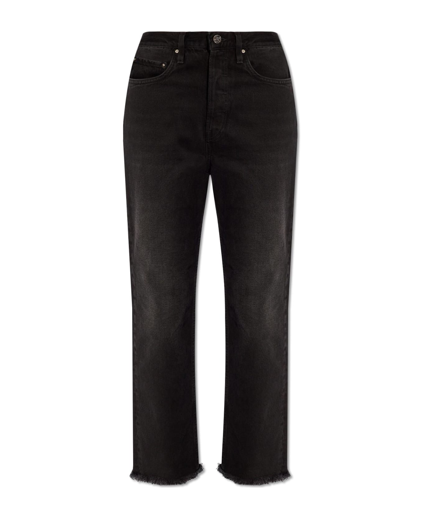 Black high-waisted jeans from Toteme. Fastened with buttons, this straight leg pair features a logo embroidery at the back, five slip pockets, high-rise waist and raw trims.
