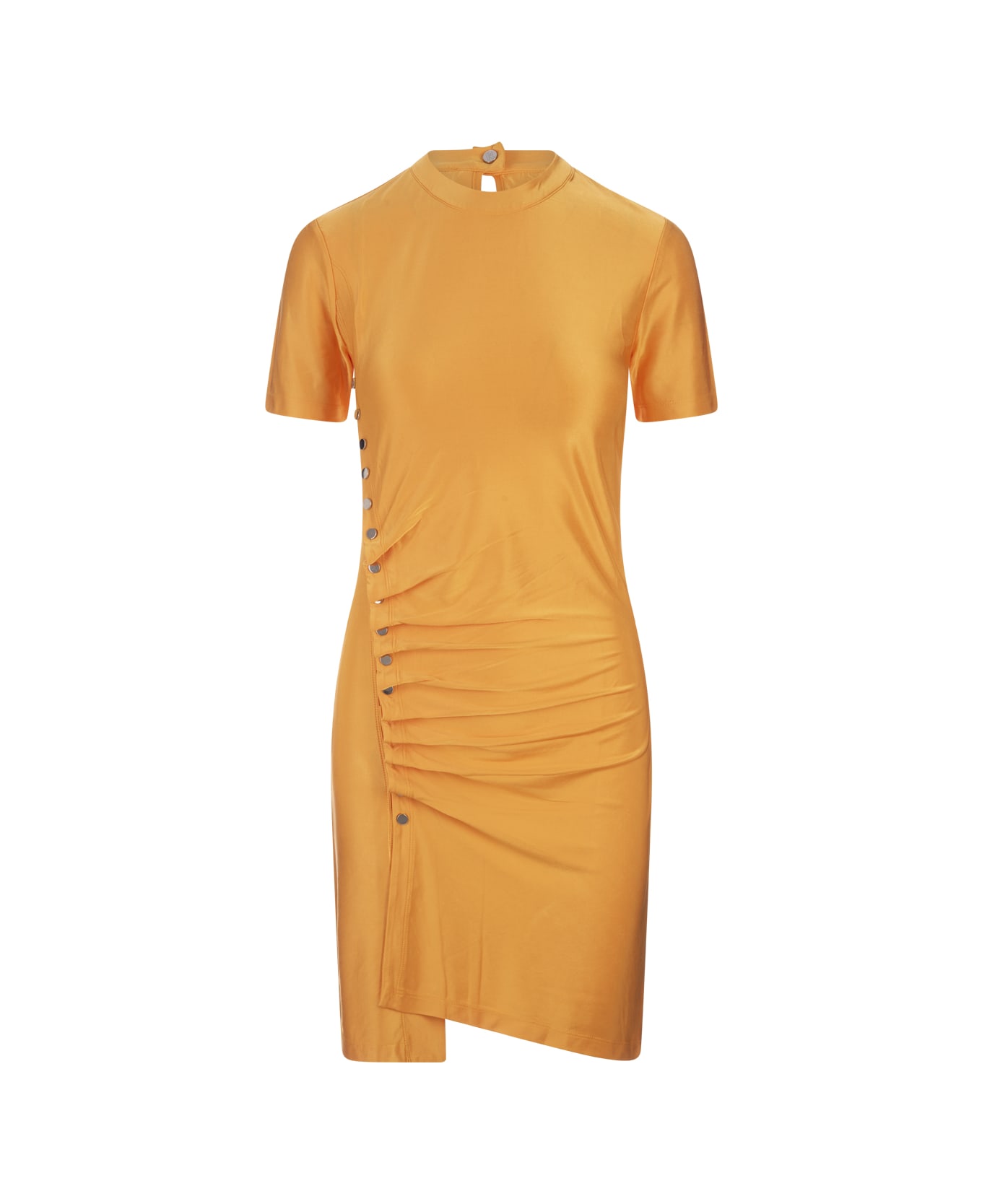 Slim-fit yellow mini dress by Rabanne made from a new fabric with a silky feel. It features a short sleeve design with a crew neck, a draped design, an asymmetric hem and logo press studs.