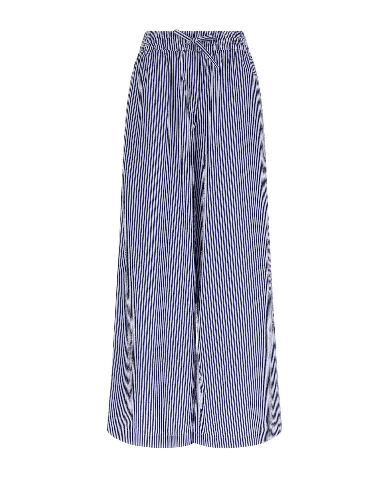 'Cashine' striped cotton poplin pants with all-over rhinestones, wide straight leg, drawstring elastic waistband, pockets.