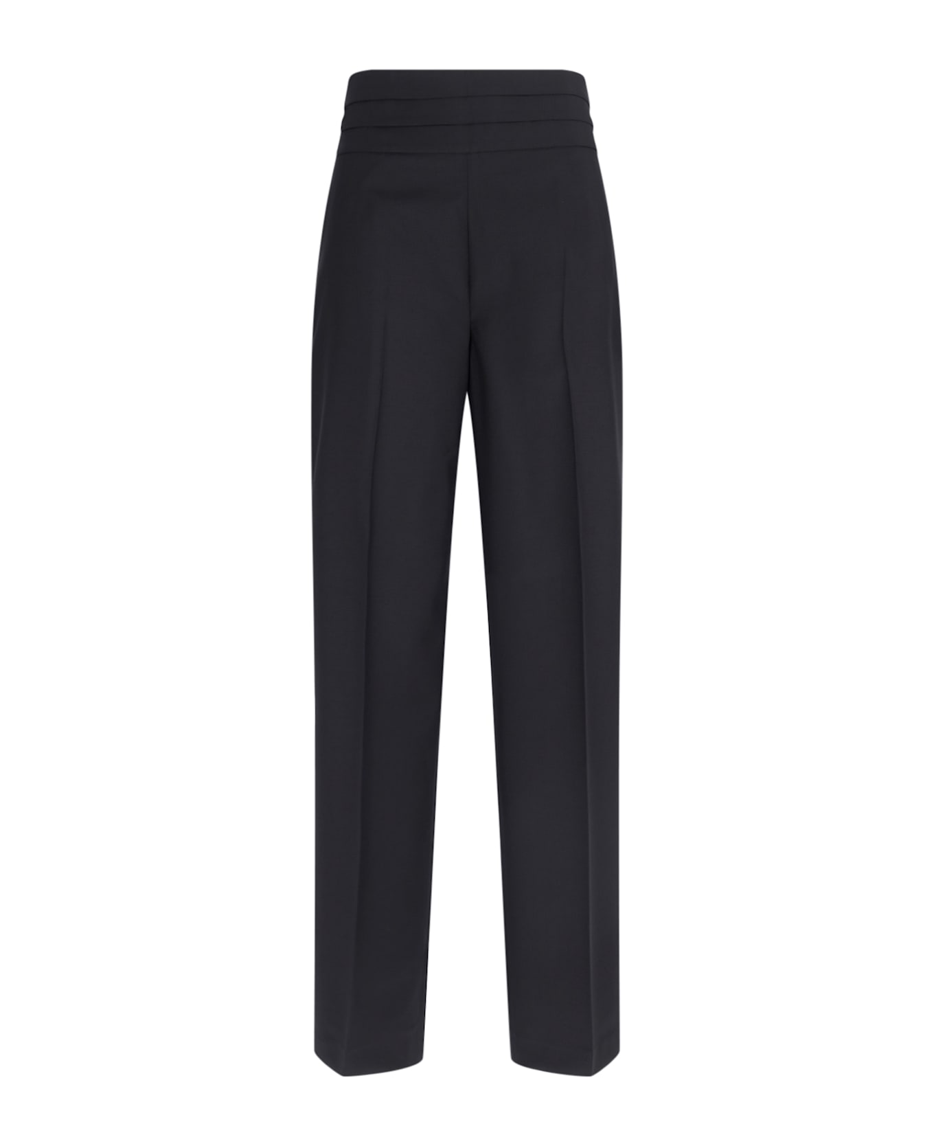 Róhe "Cumberband" trousers, in black wool, high waist, tailored belt, two side pockets, two pleats front and back, button fastening at the back, two welt pockets at the back, straight leg.