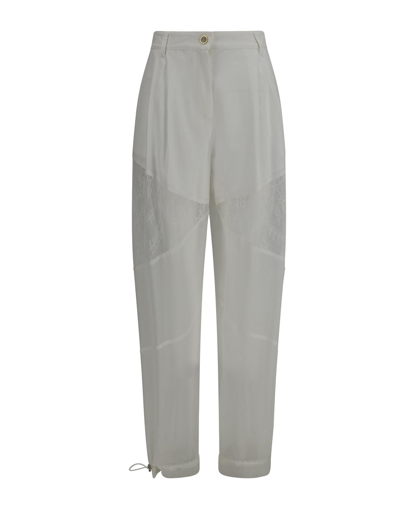 The nacy pants with lace inserts by pinko embody a refined balance between tailored structure and contemporary femininity. designed with front darts that define the silhouette, the style stands out for its lace inserts, adding a sophisticated touch while keeping the overall look clean. the concealed button and zip closure ensures a streamlined finish, while the front pockets and embroidered logo on the back introduce subtle brand identity. belt loops and a drawstring at the hem allow for adjustable styling, and the elasticated hem enhances comfort and versatility, making the trousers suitable for polished everyday outfits as well as more elevated looks.