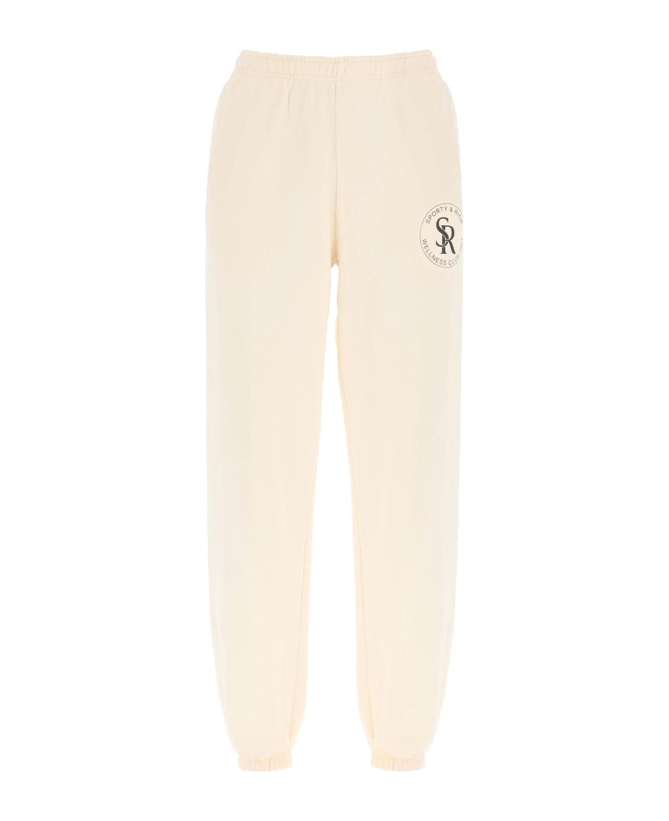 Sporty & Rich sweatpants in brushed-back cotton fleece with front logo print. Loose-fitting style featuring elasticated cuffs, elasticated waistband with internal drawstring, curved side pockets and a rear patch pocket. The model is 177 cm tall and wears a size XS.