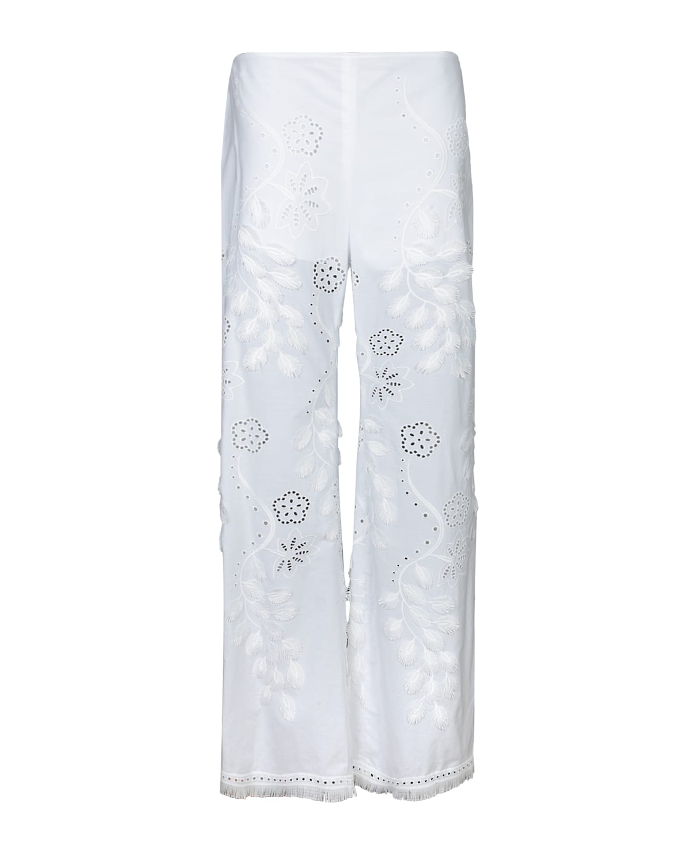 Elegant and breezy, these Alberta Ferretti trousers meld the romantic allure of white sangallo with embroidered detailing and delicate fringes for a touch of motion.