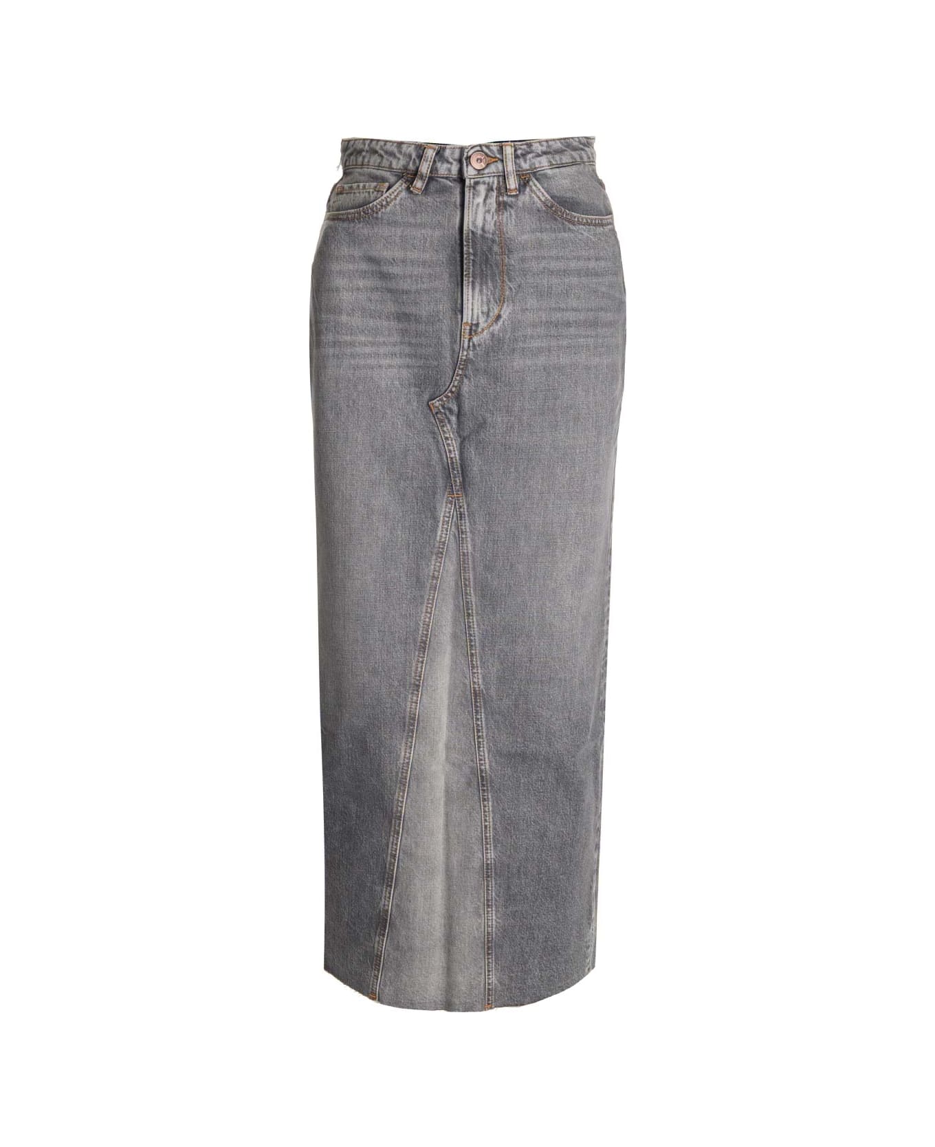 'Charlotte' gray denim long skirt from 3x1, with tobacco brown stitching, 5 pockets, medium waist, hidden zip and button. Composition: 100% Organic Cotton