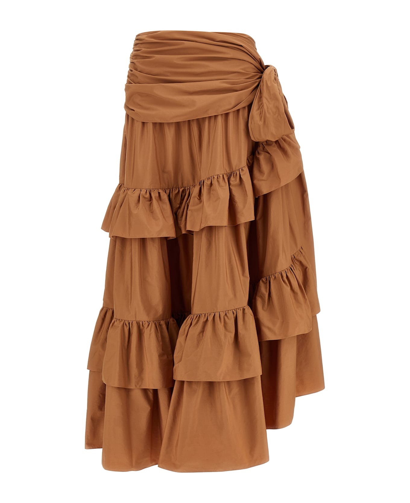 Long skirt in cotton poplin, draped silhouette with flounces and ruffles, sash to tie in a bow on the side, side zip closure, asymmetrical hem. SUSTAINABLE: This product is made with organic cotton. Composition: 100% cotton