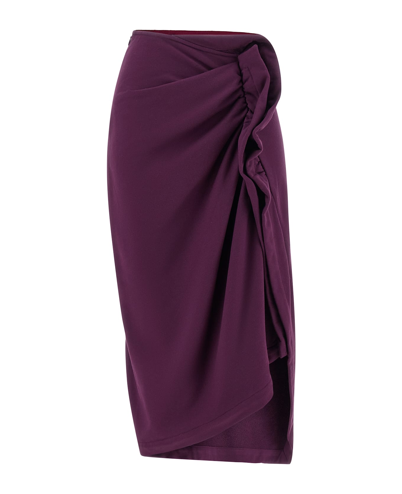 'Hanam' midi skirt in fleece cotton, ruffles with draping and central split, and asymmetrical hem.