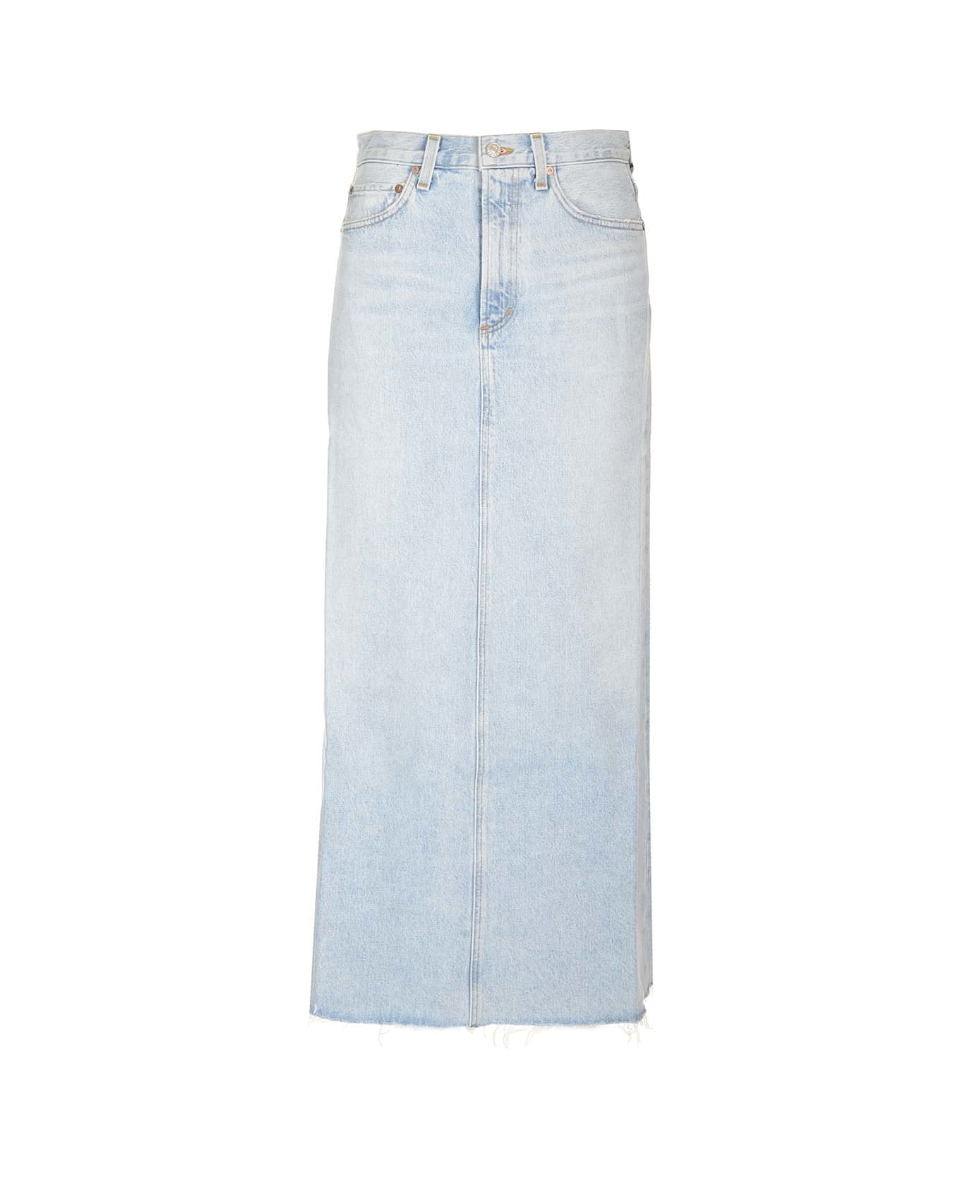 'Hilla' midi skirt in light blue jeans from Agolde, with 5 pockets and central slit.